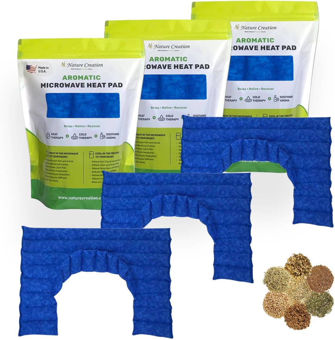 Nature Creation microwaveable & reusable Lumbar Microwavable Heating Pads can conveniently be used on your lower back, adomen or other parts of your body. If you want a multipurpose heating pad for lower back discomfort, bruises, swelling, or muscle stiffness, you can place them in the microwave or freeze them. It's the ultimate hot and cold pad. It has an ideal weight which provides gentle pressure. Each heating pad has natural ingredients like flax and wheat that excel at holding heat for long periods to keep you warm and cozy no matter where you are. Filled with an aromatic mix of herbs, as soon as you open the package you'll be smelling soothing scents. Whether you use it as a warm compress or a cold compress, the amazing smells of herbs like chamomile, cinnamon, and lemongrass may help reinvigorate you. Our heating and cooling pad feature a super soft cotton fabric that gently hugs your skin and provides heat. Also, our heating pad can be a lovely gift of wellness for someone you care about! Our lumbar pads make an excellent gift for birthdays, holidays, or just because!