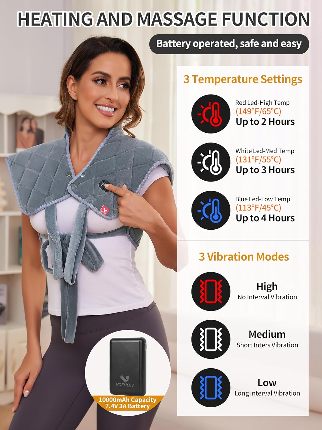 | Additional Features | 3 Temperature Settings, Battery Operated Heating Pad, Portable Cordless Design, Rapid Heating, Weighted |