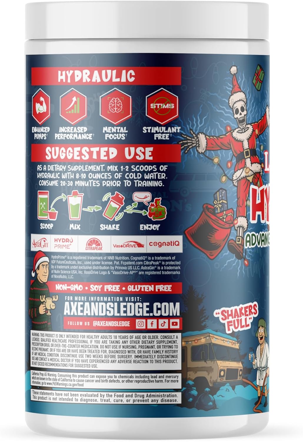 Axe & Sledge Hydraulic Stim-Free Pre-Workout Powder is designed to unlock your full potential without the jitters or crashes of stimulant-based formulas. Packed with Creatine MagnaPower and CarnoSyn Beta-Alanine, it enhances performance, strength, and endurance, allowing you to get the most out of every workout. Featuring Nitrosigine and HydroMax, Hydraulic delivers massive pumps, increasing blood flow and nutrient delivery to your muscles for that vascular, hard look that lasts. This stimulant-free pre-workout helps elevate focus, strength, and power, making it perfect for training at any time of day, including late-night sessions. Formulated with five patented ingredients such as AgmaMax and Nitrosigine, Hydraulic is also third-party tested and Informed-Sport Certified, ensuring safety and performance without any banned substances. Manufactured in the USA in a cGMP-certified facility, each scoop offers premium quality for the ultimate training experience.