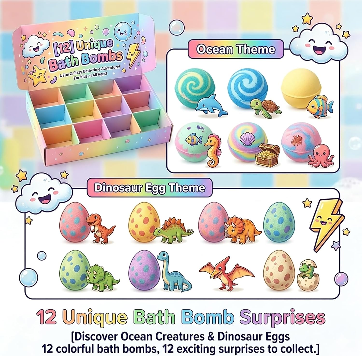 SPECIFICATIONSMain Ingredients: Glycerin, Citric Acid, Mineral Sea SaltTheme:Ocean/Dinosaur Egg/Zoo AnimalPACKAGE INCLUDES1 x 12 pcs Bath Bombs Gift Set