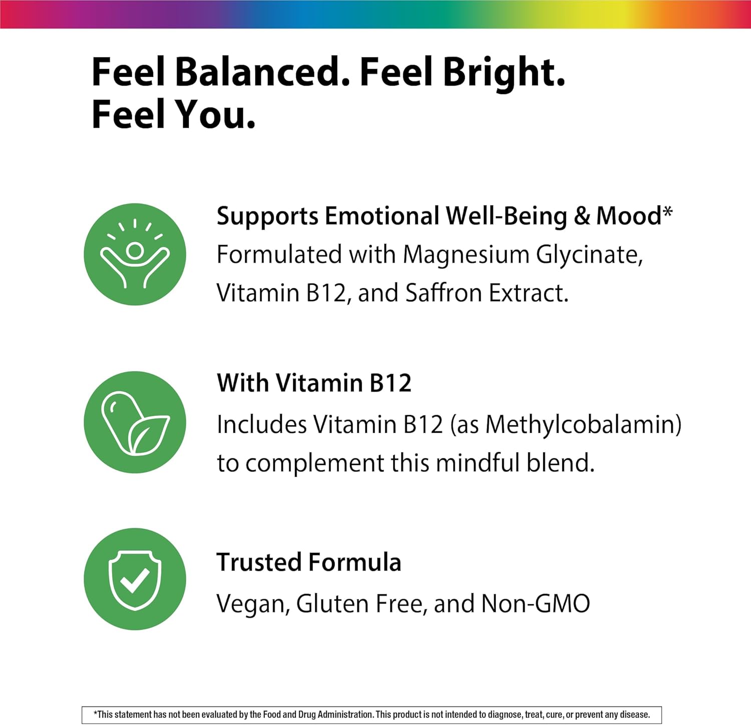 Find Your Calm, Brighten Your Day Life moves fast, but balance and calm are always within reach. This mindful blend of magnesium glycinate, vitamin B12, and saffron extract is designed to complement your routine while helping support emotional well-being and a positive mood.* 90 Vegan Capsules Designed for everyday ease, this two-capsule daily serving can be taken with or without food and fits seamlessly into your daily routine. Non-GMO, vegan, and made without wheat, gluten, milk, tree nuts, peanuts, soy, eggs, fish, shellfish, artificial flavors, or artificial sweeteners. Rainbow Light For 45 years and counting, Rainbow Light has been trusted by millions, providing bio-balanced supplements made with real food nutrients. Crafted with a commitment to quality and potency, our formulas offer a simple way to give yourself and your family a solid foundation to thrive every day. *These statements have not been evaluated by the Food and Drug Administration. This product is not intended to diagnose, treat, cure, or prevent any disease.