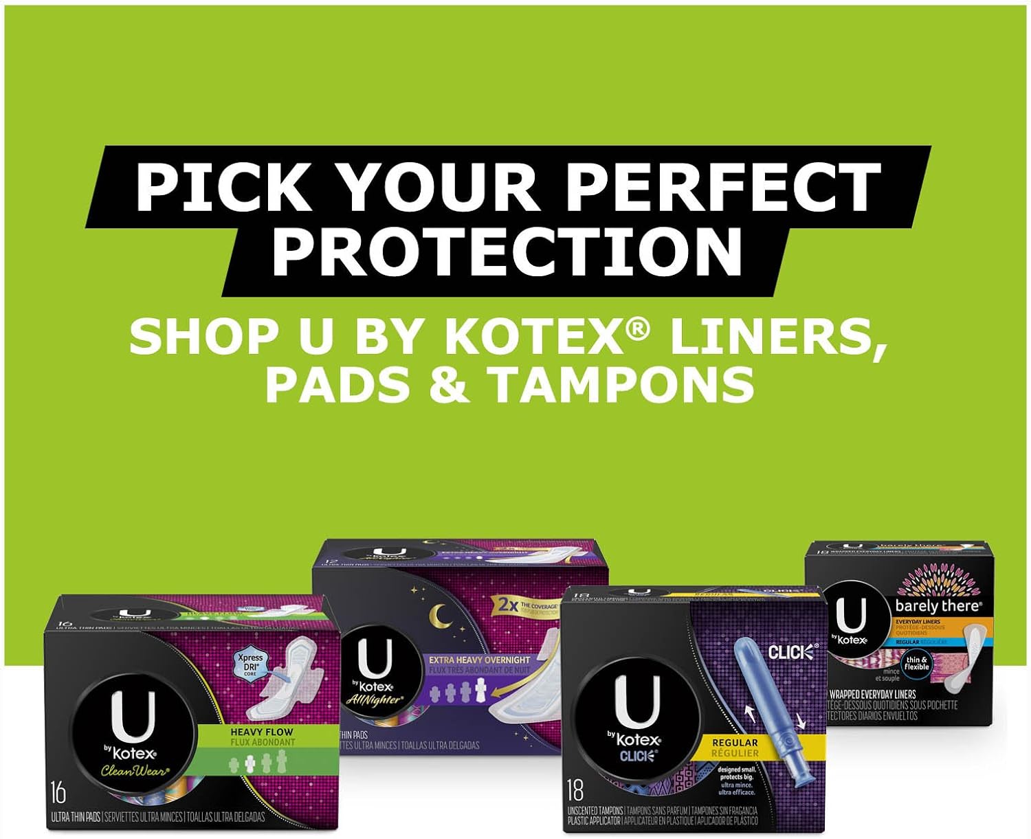 Your heaviest flow days won’t stand a chance with U by Kotex CleanWear Ultra Thin Pads Heavy Flow with Wings. These period pads for women feature the 3D Capture Core with Xpress DRI cover that quickly draws in and locks away wetness. The uniquely shaped Tru-Fit wings help keep this feminine pad in place to prevent bunching so it keeps up with you and your flow. These heavy absorbency pads are designed with super soft sides to help you move with comfort and ease. These sanitary napkins are latex-free, lotion-free and unscented. Each pad is individually folded in an easy-open wrapper with four colorful designs. For a nighttime period pad solution, check out U by Kotex AllNighter Ultra Thin Overnight Pads with Wings.
