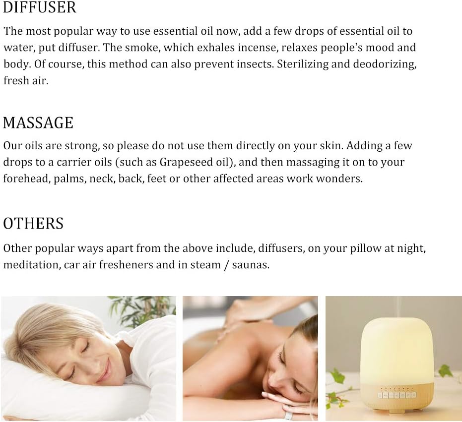 | Scent Name | Blueberry, Neroli, Lotus, Peach, Cherry Blossom, Calendula, Coffee, Marjoram, Grape, Magnolia, Tuberose, Honeysuckle, Peony, Coconut Vanilla, Violet, Gardenia, Carnation, Wintergreen, Pineapple, Yougu |