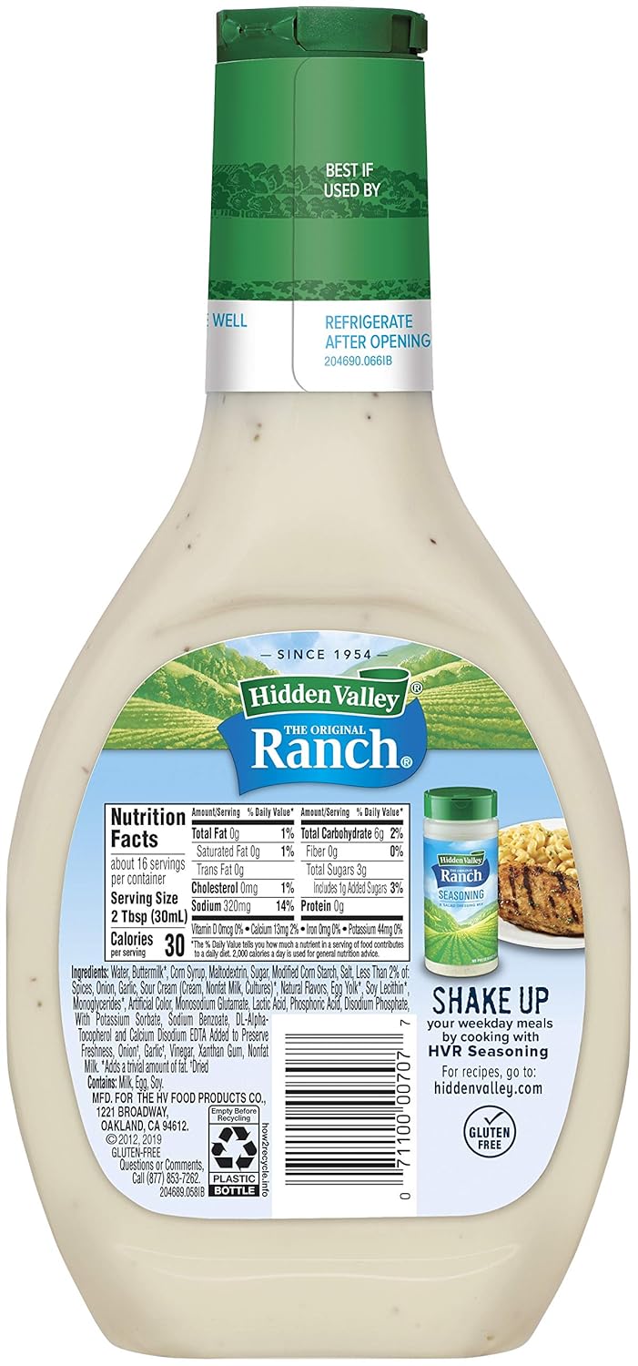Whip up a quick, easy dish with Hidden Valley Original Ranch Fat Free Dressing. Our Original Ranch Fat Free dressing makes it simple to get your daily dose of veggies. The new flip cap lid is easy to open and close while delivering a more controlled pour for fewer messes. Toss Hidden Valley Original Ranch Fat Free Dressing with mixed greens and chopped tomatoes for a main dish or side salad, or mix with pasta or potatoes to serve at your next BBQ. Hidden Valley Original Ranch Dressing also makes a delicious addition to sandwiches, wraps and burgers, or as a fat free ranch dip with a vegetable tray, chips, or chicken strips. This gluten-free, fat free ranch is as versatile as it is tasty.