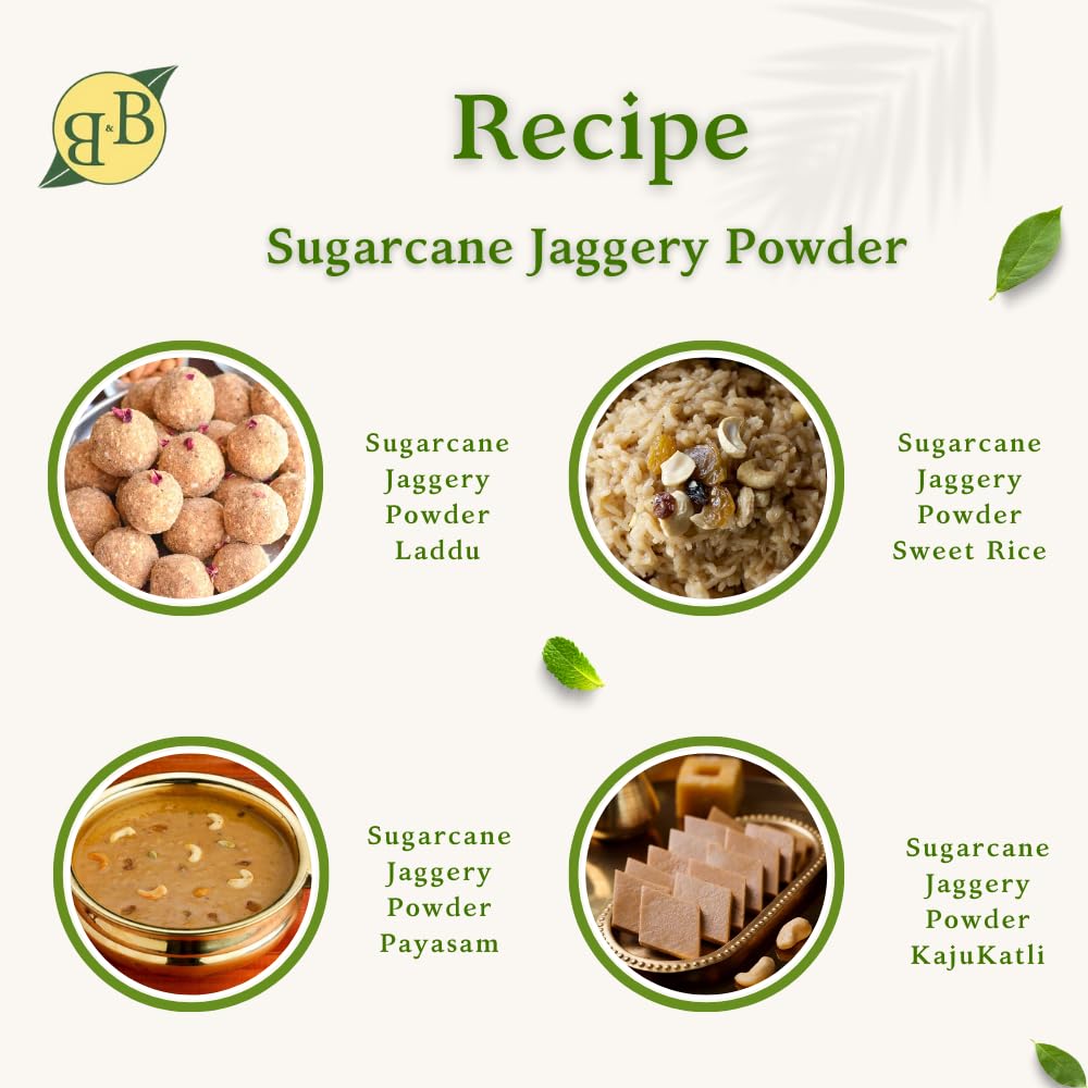 B&B Organics sugarcane jaggery powder is processed from organically grown sugarcane which is grown in southern part of India. The harvested sugarcane undergoes various steps before being converted into a powder. It is a natural sweetener derived from concentrated sugarcane juice. The concentrated juice is further dried and processed to reach unrefined form. This is a natural sweetener and does not undergo any chemical process which means the sweetener is unrefined. This is a traditional sweetener. The product is carefully processed and packed before it reaches the customer.