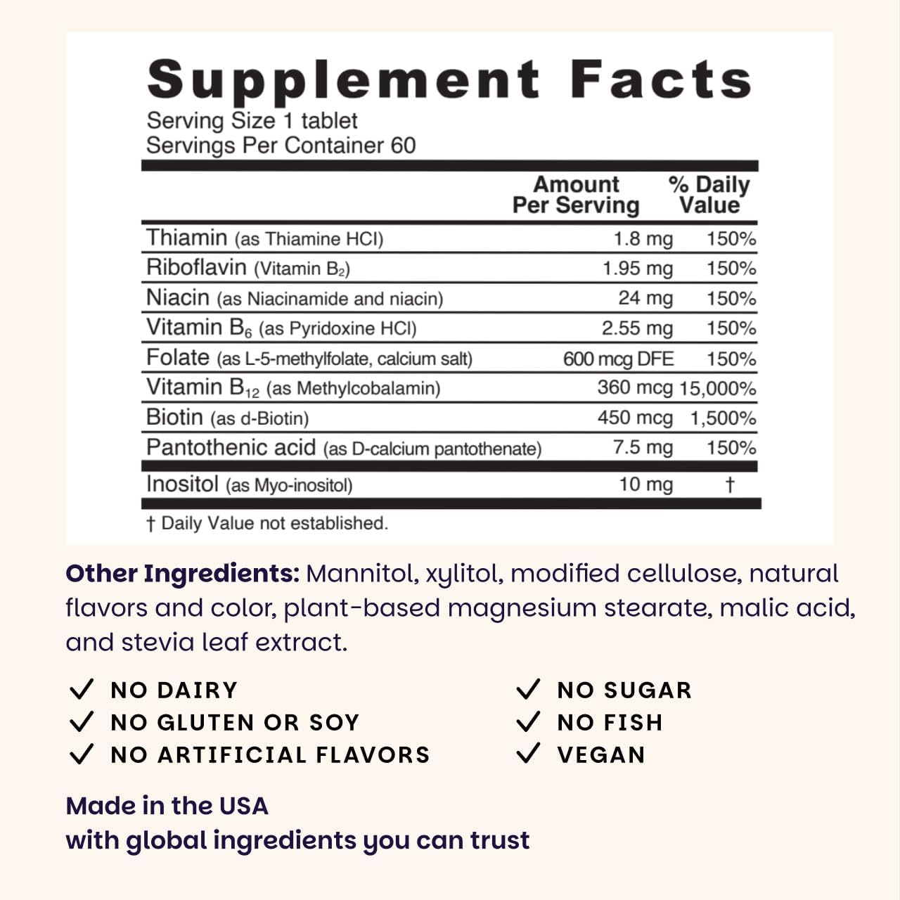 | Product Benefits | Dissolvable Vitamin B-Complex with Methyl B12 and Methyl Folate |