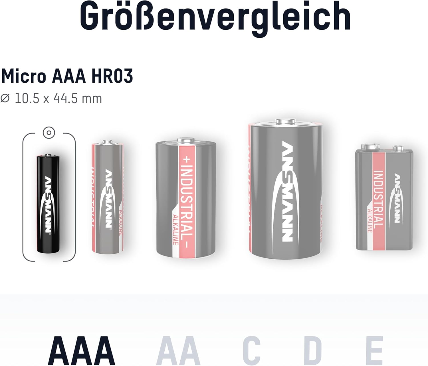 High performance micro AAA ANSMANN alkaline batteries, optimal leakage protection, ANSMANN brand quality suitable for applications in industry, large consumers, medical technology and event technology, mercury and cadmium free