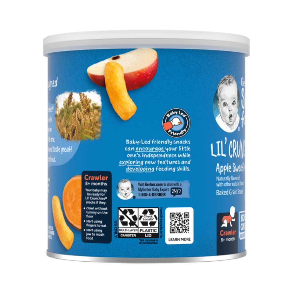 Make every little bite count with Gerber Lil' Crunchies Baked Corn Snack. Each serving is made with 2g of whole grain goodness and never any artificial flavors, artificial colors and NO GMOS. Gerber Lil Crunchies has the ideal texture that is easy to chew and swallow and is sized just right for older babies learning to pick up. Our Approach to Sustainability Gerber was founded on the ambition to give babies the best start in life. That's why our work doesn't stop at nutrition, and why every day, we take action to protect the planet so Gerber babies will grow and thrive for generations to come. Nestlé and Gerber are committed to improving infant and child nutrition through innovation backed by solid research. One of the most notable research efforts is the Feeding Infants and Toddlers Study (FITS), an ongoing initiative for the past 17 years to better understand the state of young children's diets and related behaviors. Nearly 10,000 parents and caregivers have been surveyed across three studies in the U.S., with more than 50 peer-reviewed publications to date.[H2] Gerber Nutrition Journey origins As a result of the 2002 FITS study, Gerber developed a program to help children start and stay healthy. When Gerber joined the Nestlé family in 2007, the Gerber Nutrition Journey was created to take advantage of the combined research, knowledge and expertise of both companies.