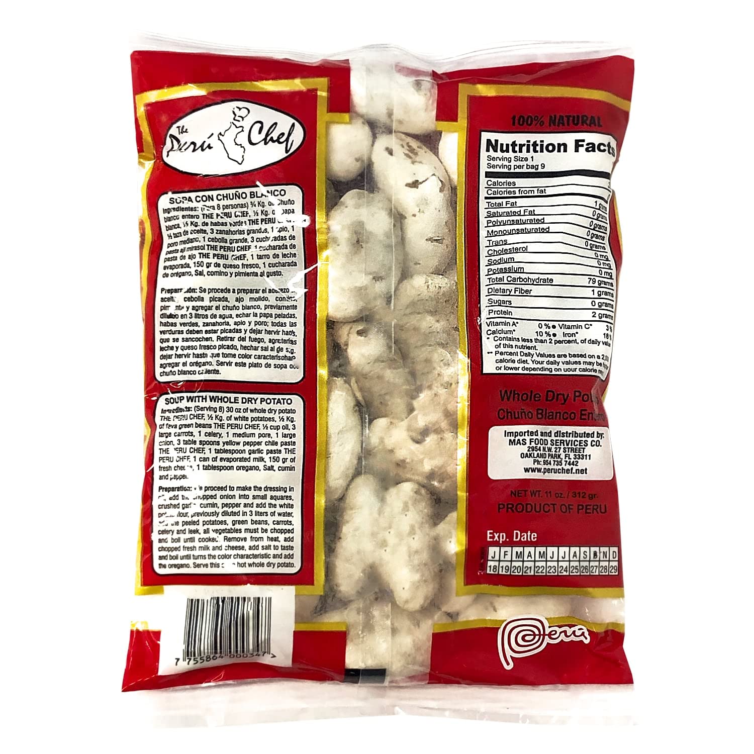 3 bags of Chuño Blanco Entero | Peruvian White Potatoes each bag weights 15 oz PeruChef Chuño Blanco Entero, also known as White Whole Dry Potatoes, is a popular Peruvian product that is perfect for creating traditional Peruvian dishes. These Kit come in a 3-pack, with each bag weighing 11 oz. Chuño Blanco Entero is made from Peruvian white potatoes and is 100% natural. It is imported directly from Peru, ensuring an authentic flavor and quality. With these White Whole Dry Potatoes, you can prepare various delicious Peruvian dishes. One classic dish is "Chupe de Chuño," a hearty potato soup with a rich broth, vegetables, and protein like chicken or seafood. Another option is "Causa Rellena," a traditional Peruvian dish made with mashed potatoes seasoned with lime juice and layered with a filling of chicken, tuna, or vegetables. These versatile potatoes can also be used to make "Papa a la Huancaina," where boiled potatoes are topped with a creamy cheese and yellow chili sauce, or "Pachamanca," a festive dish consisting of meat, potatoes, and vegetables cooked in an underground oven. PeruChef Chuño Blanco Entero opens up a world of possibilities for creating authentic Peruvian flavors in your own kitchen.