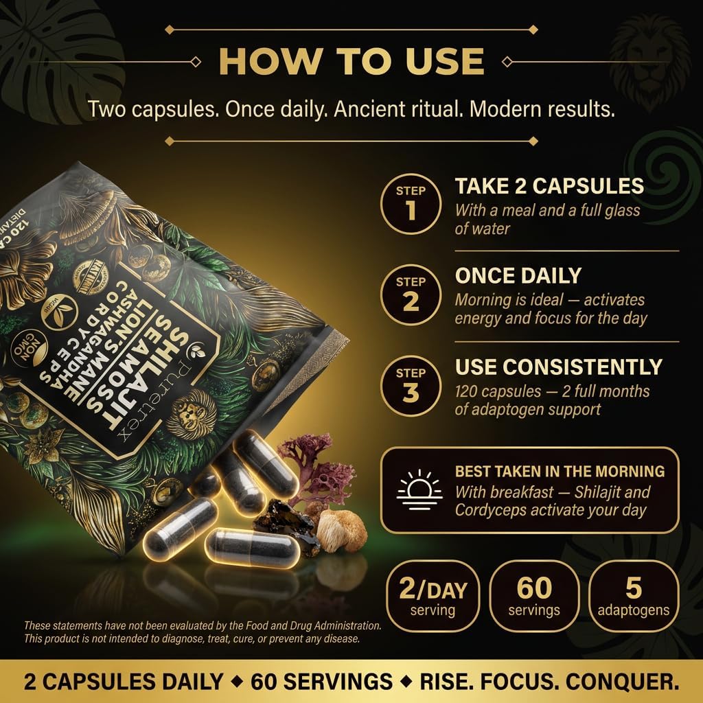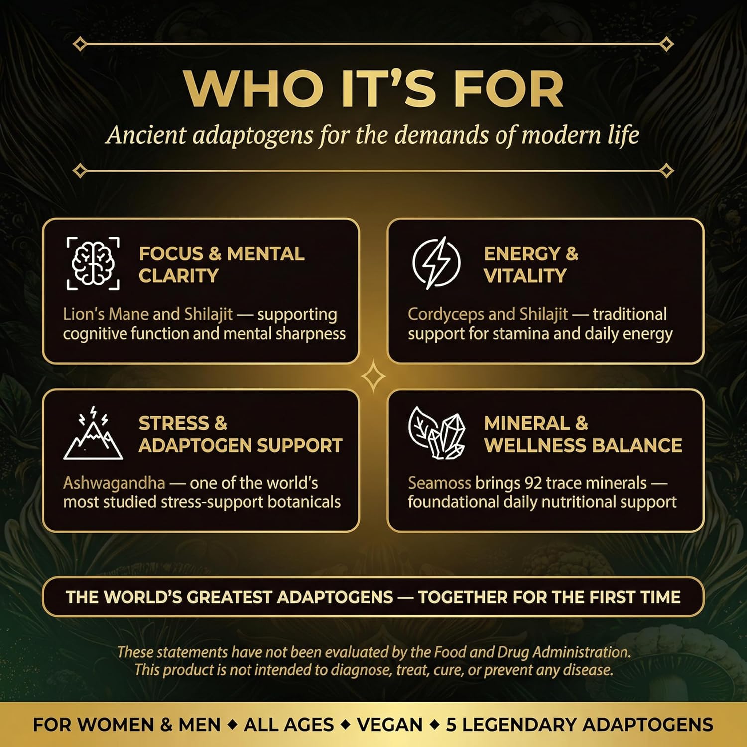 | Special Ingredients | Ashwagandha, Cordyceps, Lion's Mane, Seamoss, Shilajit |