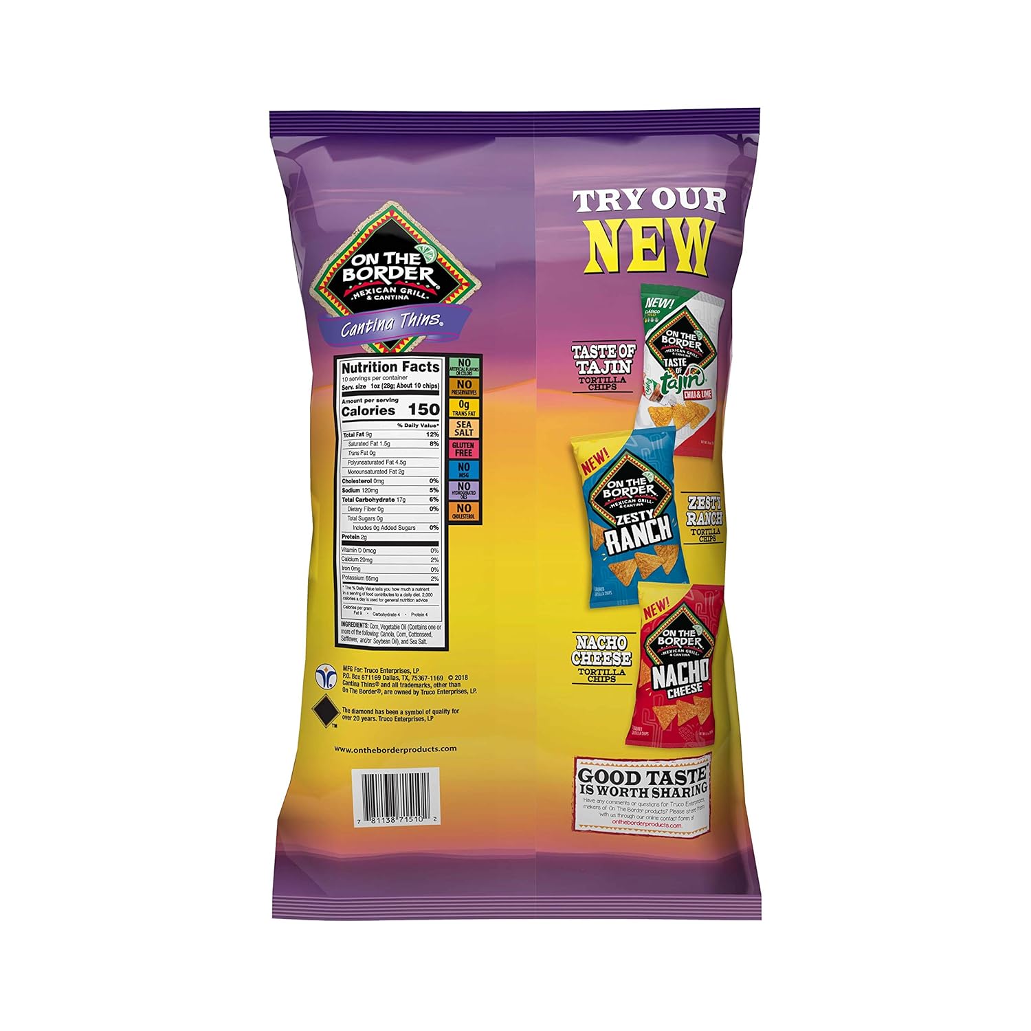 ON THE BORDER Cantina Thins are the fresh, crispy, craveable chips that bring the real Cantina experience to your home! They're perfect as a delicious snack or served on a party spread with ON THE BORDER Salsa and ON THE BORDER Queso. We craft ON THE BORDER Cantina Thins using simple ingredients including only corn, oil, and sea salt for a simply delicious taste. Our chips are also gluten-free and free of artificial flavors, Preservatives, and trans fats. At ON THE BORDER, making delicious, authentic chips, salsas and quesos is our passion. We choose every ingredient purposefully and craft them slowly with care to make the kind of food that says: take a break. Kick back. Pop open a bag and enjoy life's little moments. It's better ON THE BORDER!