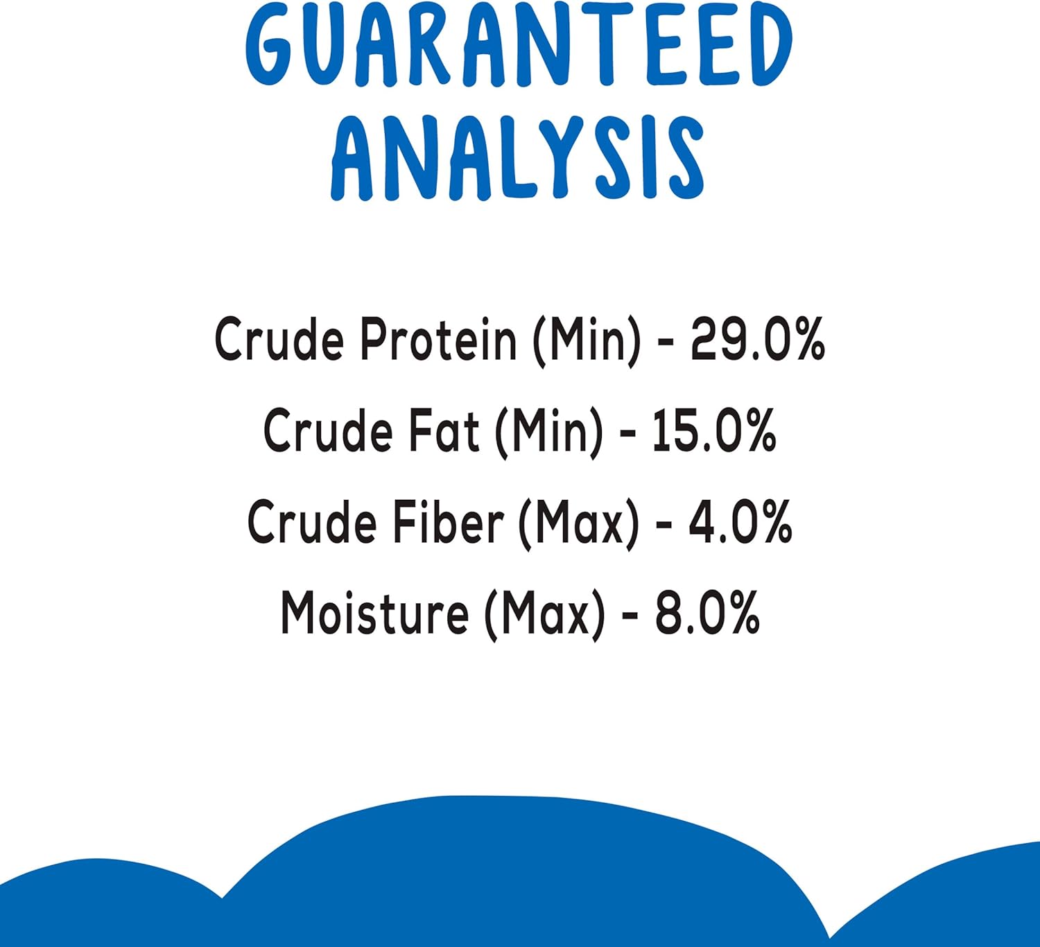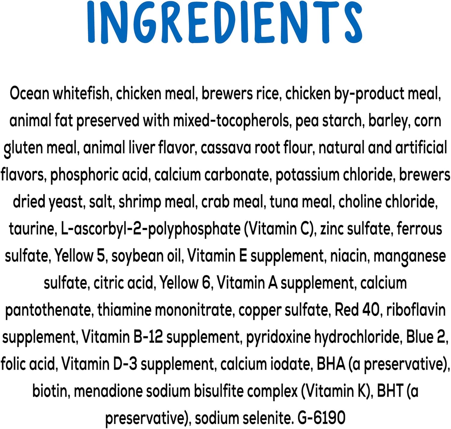 Surf's up! And the waves of deliciousness are rolling in with flavors as good as the ocean is deep. Woah - that's scrumptious.Every crunchy, yummy delicious bite lets your cat know loud and clear - it's Time to Party!Ingredients: Chicken By-Product Meal, Brewers Rice, Animal Fat Preserved with Mixed-Tocopherols, Corn Gluten Meal, Animal Liver Flavor, Fish, Natural and Artificial Flavors, Phosphoric Acid, Calcium Carbonate, Brewers Dried Yeast, Salt, Shrimp Meal, Crab Meal, Tuna Meal, Choline Chloride, Added Color, Taurine, L-Ascorbyl-2-Polyphosphate (Source of Vitamin C), Zinc Sulfate, Ferrous Sulfate, Yellow 5, Vitamin E Supplement, Niacin, Manganese Sulfate, Citric Acid, Yellow 6, Vitamin A Supplement, Calcium Pantothenate, Thiamine Mononitrate, Copper Sulfate, Riboflavin Supplement, Red 40, Vitamin B-12 Supplement, Pyridoxine Hydrochloride, Blue 2, Folic Acid, Vitamin D-3 Supplement, Calcium Iodate, BHA (a Preservative), Biotin, Menadione Sodium Bisulfite Complex (Source of Vitamin K Activity), BHT (a Preservative), Sodium Selenite. F-6190.Directions: Provide adequate fresh water in a clean container daily. For your pet's health, see your veterinarian regularly. Feeding Instructions: Feed as a treat to your adult cat. This product is a treat and is not intended to be fed as a meal. Feed 2 treats for each 1 pound of body weight, not to exceed 10 treats per day. The caloric intake from treats should not exceed 10% of a cat's total daily caloric requirement. If treats are given, the amount of food should be reduced accordingly. Store in a cool, dry place. Reseal for freshness.Guaranteed Analysis: Crude Protein (Min)...30.0%, Crude Fat (Min)...15.0%, Crude Fiber (Max)...4.0%, Moisture (Max)...8.0%.