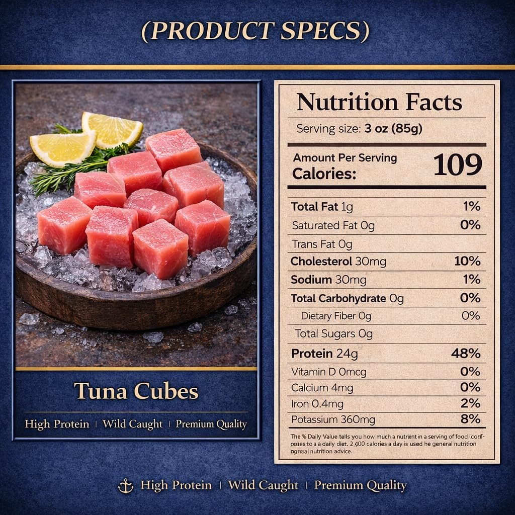 • 🌊 100% Wild-Caught Tuna – Hand-selected premium tuna cubes, wild-caught, boneless, and skinless, delivering natural ocean-fresh flavor in every bite.