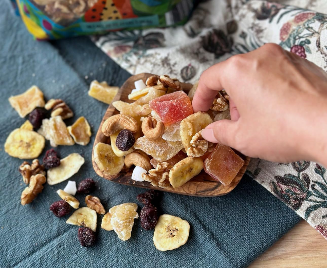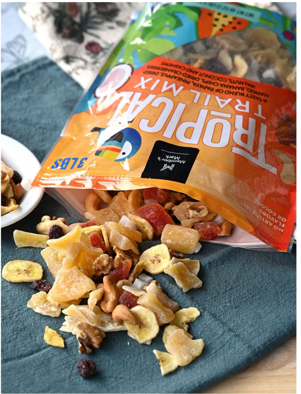 48 ounce resealable bag Contains dried fruit, roasted cashews and raw walnuts Ideal for eating on-the-go Resealable bag keeps everything fresh