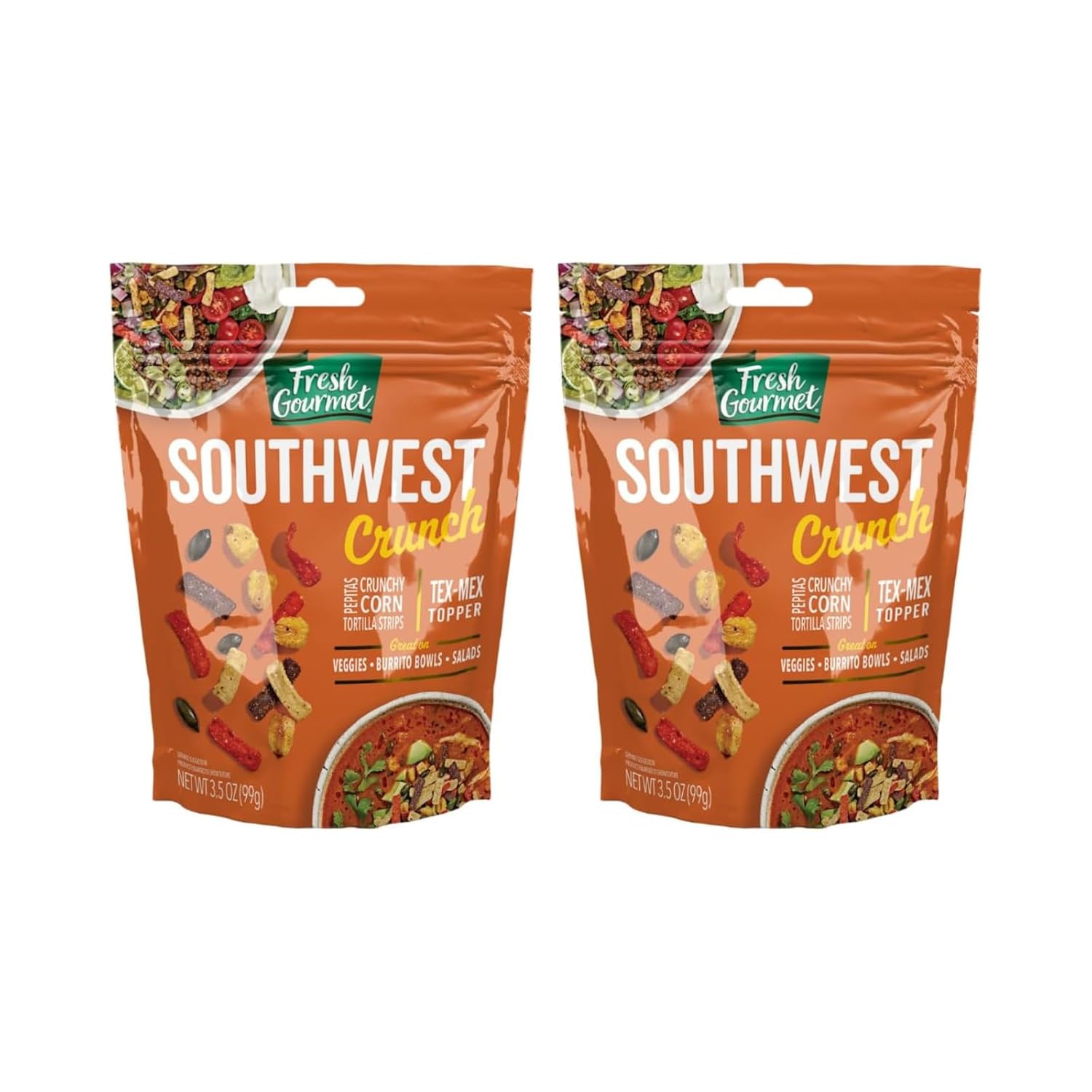 Introducing Southwest Crunch, the perfect companion for elevating your salads, veggies, and burrito bowls to a whole new level of deliciousness. This crunchy blend of corn, tortilla strips, pepitas, and a flavorful Tex-Mex topper adds a burst of flavor and texture that will tantalize your taste buds. Crunchy Corn Delight: Our Southwest Crunch features crispy corn bites that bring a delightful crunch to every bite. The natural sweetness of corn complements the savory goodness of your favorite dishes. Versatile Tex-Mex Topper: Sprinkle Southwest Crunch on salads, veggies, or burrito bowls for an instant flavor boost. The Tex-Mex-inspired blend adds a zesty and savory kick that enhances the overall taste of your meals. Salad Topper Extravaganza: Say goodbye to boring salads! Southwest Crunch transforms your greens into a sensational experience. Elevate your salads with this mix of textures and flavors, making every bite a delightful journey. Perfect Portion Size: Each 3.5 oz bag of Southwest Crunch is packed with goodness, ensuring you have the perfect portion size for your culinary adventures. Convenient and easy to use, it's the ideal addition to your pantry. Simple Elegance, Maximum Flavor: Whether you're a seasoned chef or a home cook, Southwest Crunch simplifies the art of adding maximum flavor with minimal effort. Elevate your culinary creations effortlessly. Make your meals memorable with Southwest Crunch – the ultimate salad topper that turns ordinary into extraordinary. Elevate your dining experience with this irresistible blend of crunchy goodness. Add a dash of excitement to your salads, veggies, and burrito bowls, and savor the Tex-Mex magic in every bite. Southwest Crunch is not just a topping; it's a flavor revolution!