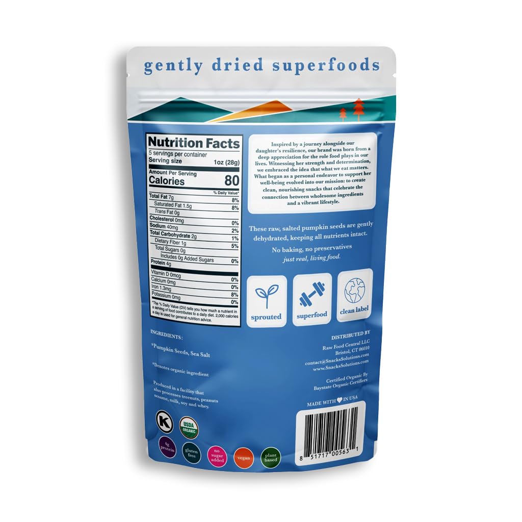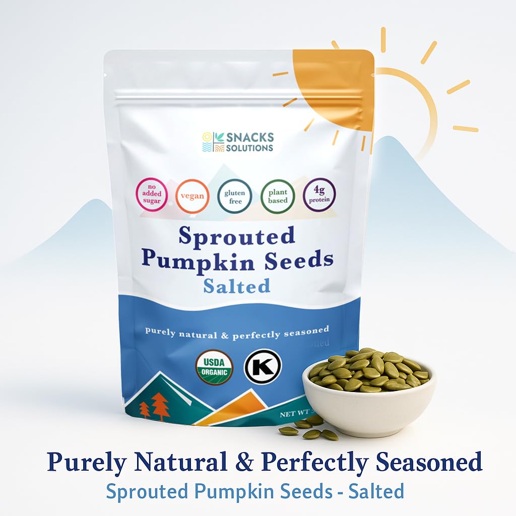 Fuel your body with Snacks Solutions Organic Sprouted Pumpkin Seeds (Salted) – a clean, nutrient-dense snack made with only two wholesome ingredients: organic pumpkin seeds and sea salt. Our seeds are sprouted and gently dehydrated to preserve all the natural nutrients, offering a crunchy superfood that’s as delicious as it is nourishing. Enjoy them straight out of the bag, or add them to salads, yogurts, smoothies, or baked recipes for an extra boost of flavor and nutrition. With no added sugar, preservatives, or artificial ingredients, Snacks Solutions brings you just real, living food in every bite.