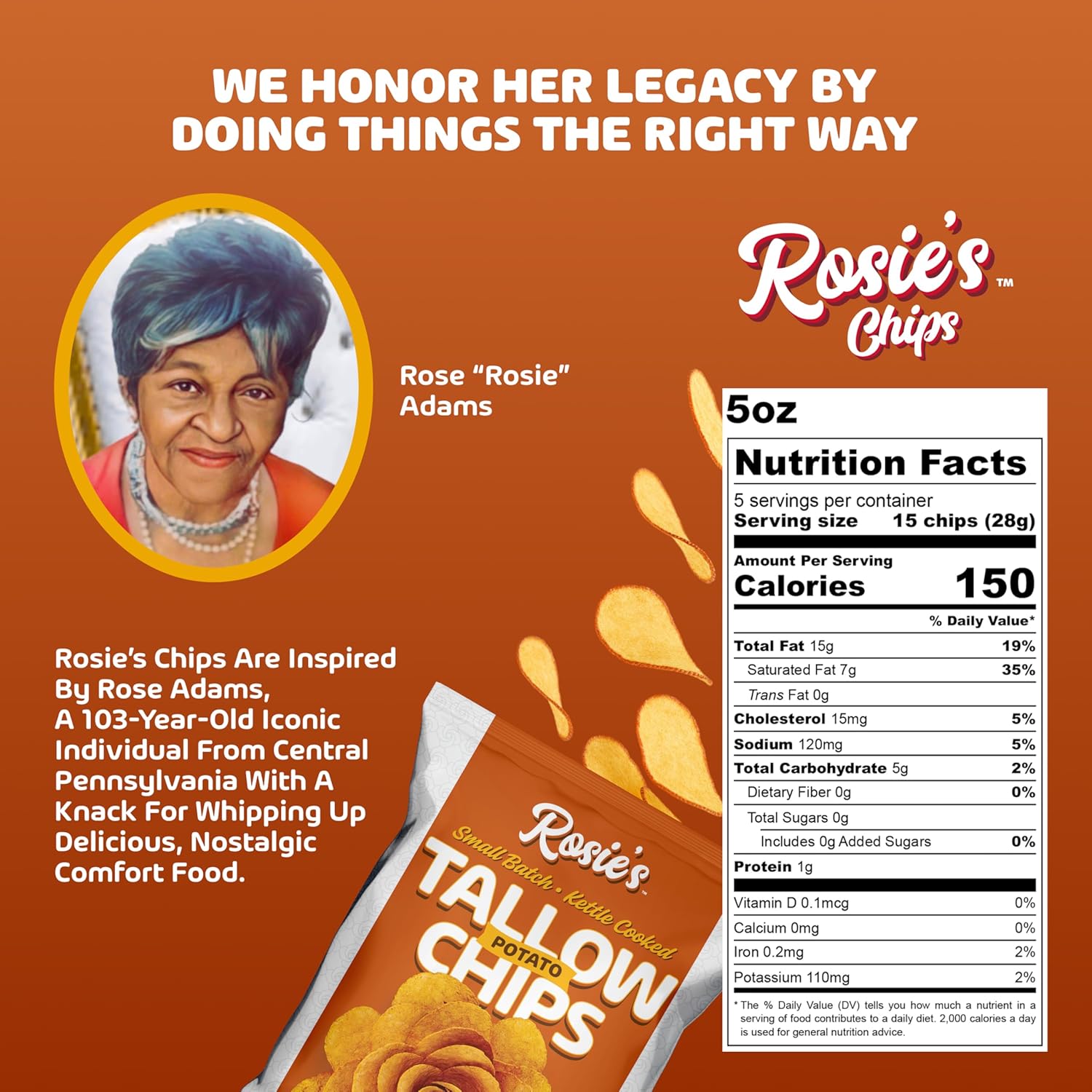 Rosie’s Keystone Smoke Beef Tallow Chips are made with just three simple ingredients: naturally grown potatoes, grass fed beef tallow, and Vera salt. These kettle cooked potato chips are prepared in small batches to create a bold crunch and deep, smoky flavor in every bite. Each batch is cooked using traditional methods that rely on beef tallow instead of modern vegetable oils. This time-tested approach gives the chips a hearty texture and rich taste without leaving a greasy feel. The Keystone Smoke flavor adds a savory finish that pairs well with meals or stands strong on its own. Every bag is free from seed oils, artificial flavors, and unnecessary additives. These seed oil free snacks are made for those who prefer straightforward ingredients and minimal processing. Whether you are searching for kettle chips, snack pack chips, or a chips pack made without vegetable oils, Rosie’s delivers a simple and satisfying option. Inspired by traditional chip-making methods, Rosie’s focuses on careful cooking and consistent results. The beef tallow is selected for stability at high heat, while Vera salt is used to season each batch evenly for balanced flavor. Available in 2 pack, 4 pack, or 6 pack options, each order includes individual 5oz bags that are easy to share, store, or take on the go. These kettle cooked chips offer a crisp texture and smoky taste that highlight the natural flavor of potato, tallow, and salt—just the way classic chips were meant to be made.