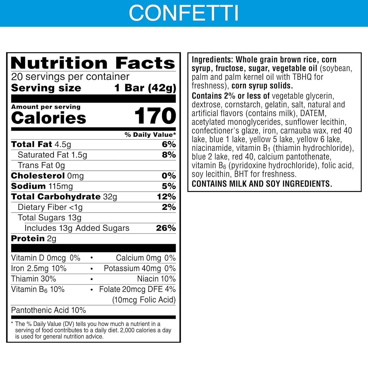 Make on-the-go snacking sweeter with Rice Krispies Treats Confetti crispy marshmallow squares made with whole grain. Each square is made with crispy whole-grain rice cereal, colorful confetti sprinkles, and the taste of soft, gooey marshmallows for a delicious, ready-to-eat treat wherever you go. A classically delicious snack, each package contains 1 individually wrapped marshmallow bar that's perfect for snacks at school, the office, traveling, lunchtime, at the game and more; It's easy to share with friends and family. Make someone's day by adding Rice Krispies Treats to goodie bags, gift baskets, and care packages. Satisfy your sweet craving with the goodness and on-the-go convenience of Rice Krispies Treats Confetti crispy marshmallow squares made with whole grain.