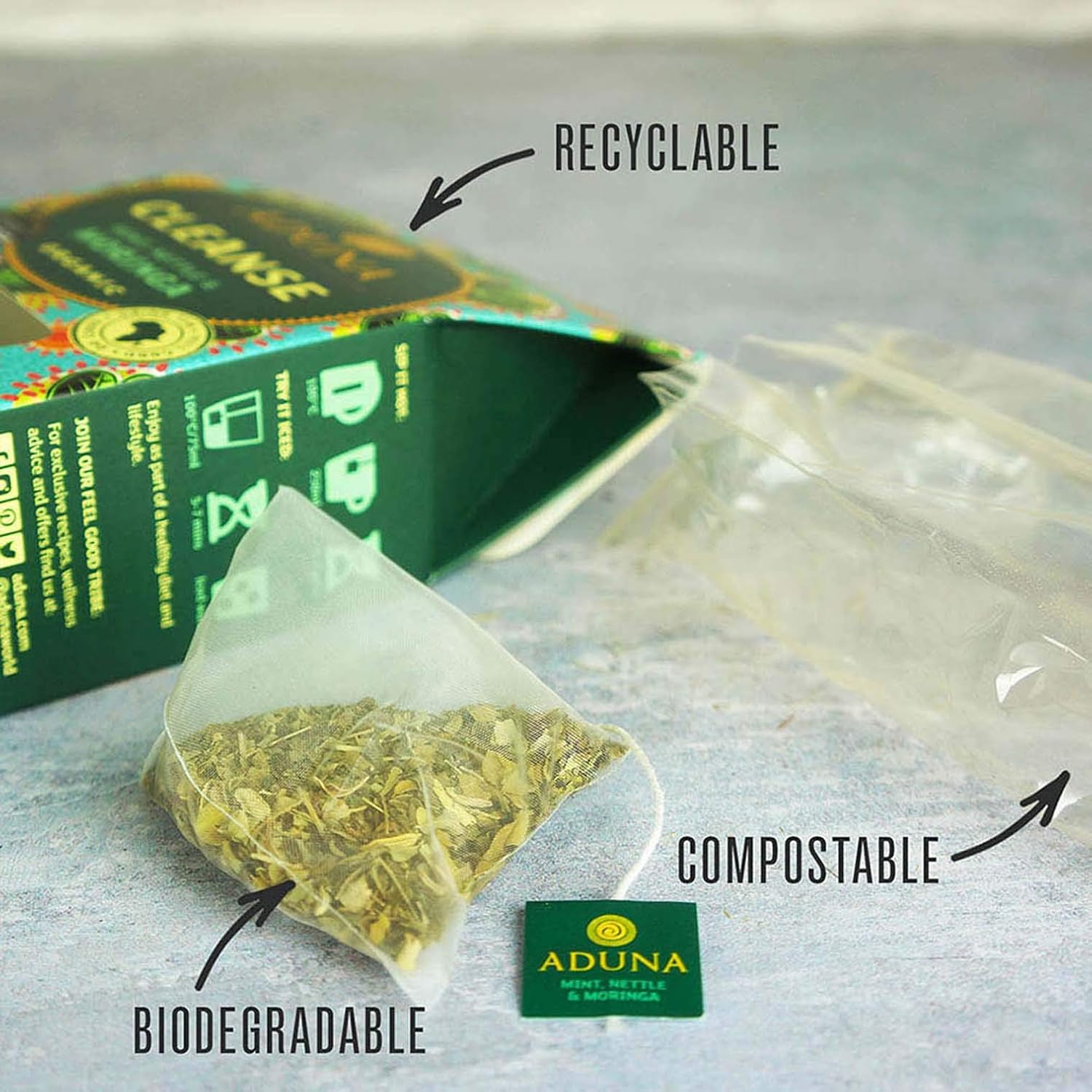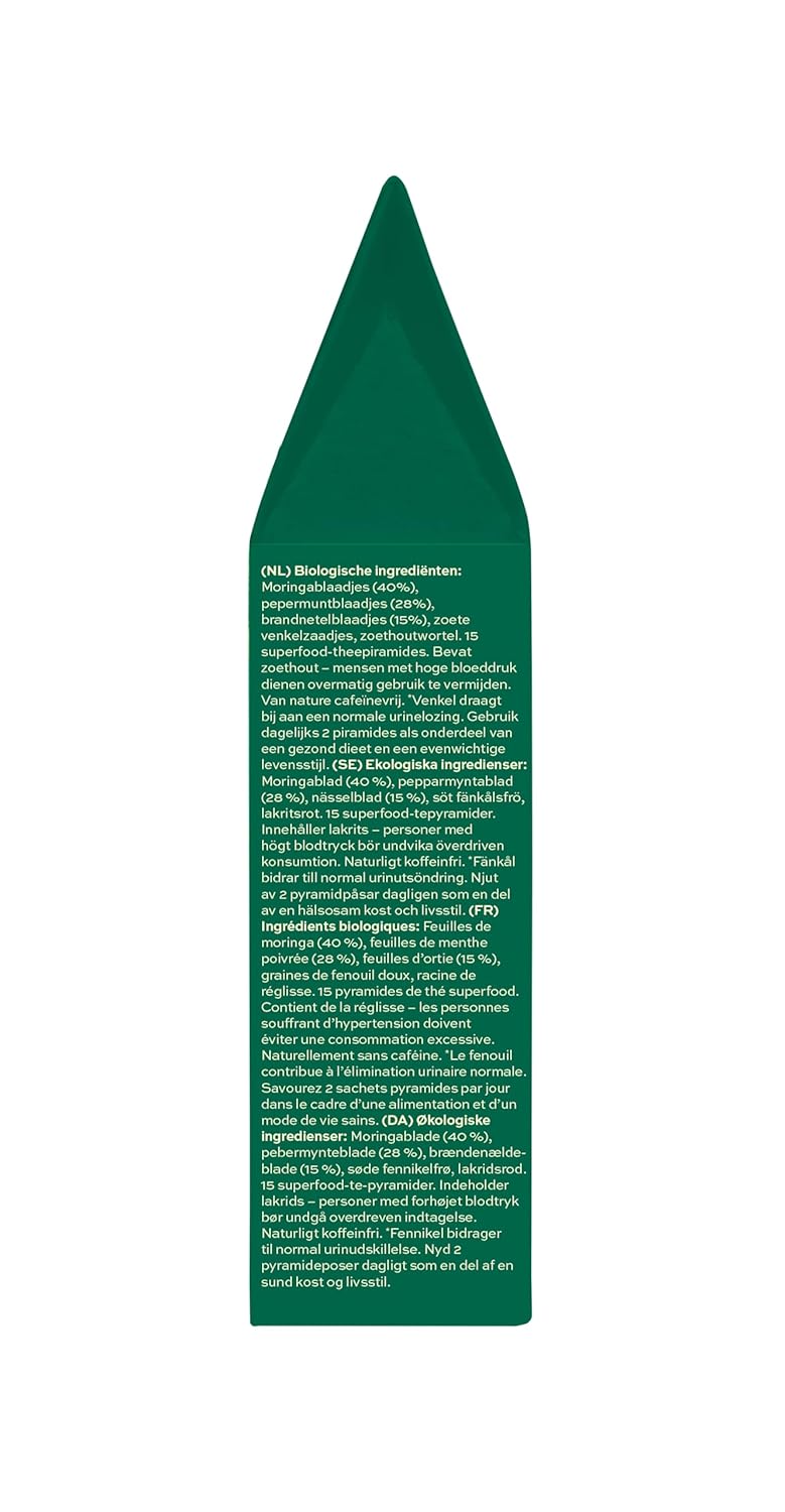 Aduna Organic Cleanse Moringa Super Tea is a soothing herbal infusion designed to help reset, refresh and restore. Whether you are unwinding after a meal or giving your gut some extra care, this naturally caffeine-free tea is your go-to digestive support in a cup. The star ingredient, moringa – also known as the miracle leaf – is rich in nutrients and revered for its natural cleansing properties. We have blended it with cooling peppermint and gentle nettle to create a delicious, feel-good tea that supports your body’s natural detox process and digestive rhythm. Moringa lends the blend a grounding, earthy base, while peppermint brings brightness and clarity to each sip. Nettle, traditionally used for its purifying properties, adds depth and a mild grassy freshness. Together, they form a balanced and calming cup that is both nourishing and easy to drink. Each pyramid bag contains only real herbs and leaves – no flavorings, powders or artificial additives – allowing the full aroma and taste of each ingredient to shine through. The pyramid shape provides plenty of room for the herbs to unfurl, giving you a deeper, more aromatic brew every time. Ideal as a post-meal digestif or anytime you want to feel a little lighter, Aduna Cleanse is a simple, natural way to support your digestive health. Serve hot with a slice of lemon or cool over ice with a sprig of mint. Inside each box, you’ll find 15 biodegradable pyramid bags filled with purpose and flavor. It is more than a tea – it is a daily ritual that helps you clear the way and feel good from the inside out.