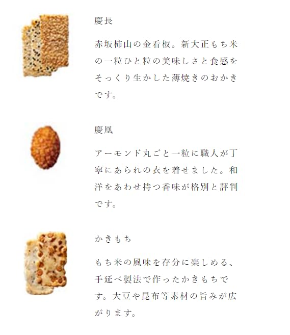 Lightly grilled Keicho that makes the best use of each grain of Shin Taisho glutinous rice, flavored okaki that is made by wrapping California almonds in okaki and baking it crisply, assorted okaki that you can enjoy Hokkaido large sleeve glutinous soybeans and Donan kelp with simple seasoning .. ■ Contents: Keicho Akasaka (salt, sesame, splashed seaweed, light soy sauce x 7 each), Keisuke Akasaka (salt, salt x 6 each, kakimochi kelp salad x 3, bean persimmon x 3 ■ Expiration date : Room temperature 150 days