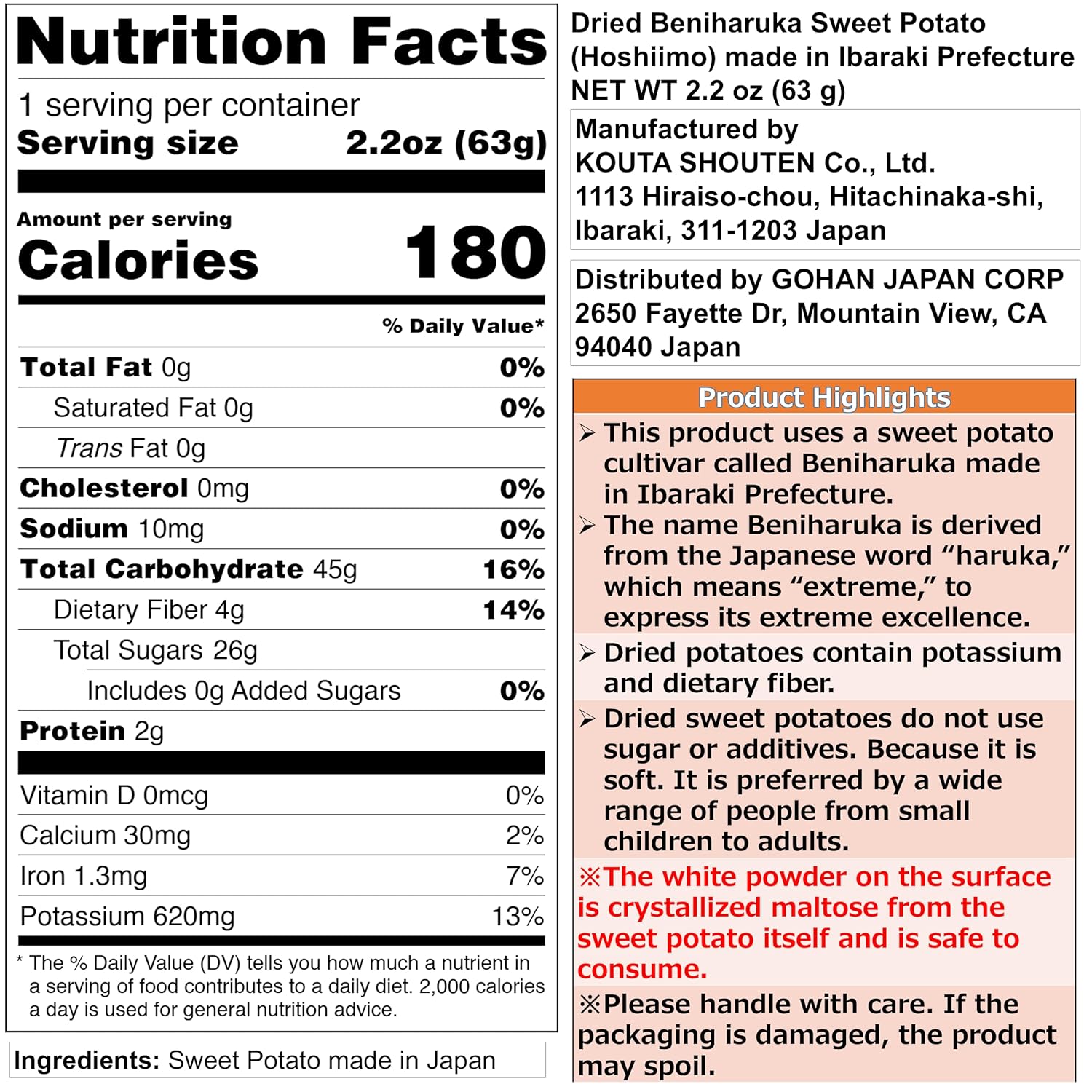 ✅The white powder on the surface is crystallized maltose from the sweet potato itself and is safe to consume.✅Each Pack (Unit) is 63 gram (2.2 oz), and this product includes 10 packs (units) and so the product weight is 630 gram (1.4 lb). ✅This product only uses a sweet potato cultivar called Beniharuka made in Ibaraki Prefecture, Japan. ✅Free from sugar or additives, letting the natural sweetness and flavor of the sweet potatoes shine. ✅Because it is soft, it is preferred by a wide range of people from kids to adults. ✅Luxurious hoshiimo made from the best ingredients nurtured by the Ibaraki sun. ✅No Sugar or Additives and Natural Snacks. ✅Perfect for a diet-friendly snack, and a filling and highly satisfying snack! ✅With a low glycemic index, it won't spike your blood sugar. ✅Dried Sweet Potatoes are full of rich nutrients (Vitamins, Potassium, Iron and Fiber), real Nutrition for Your Daily Life!