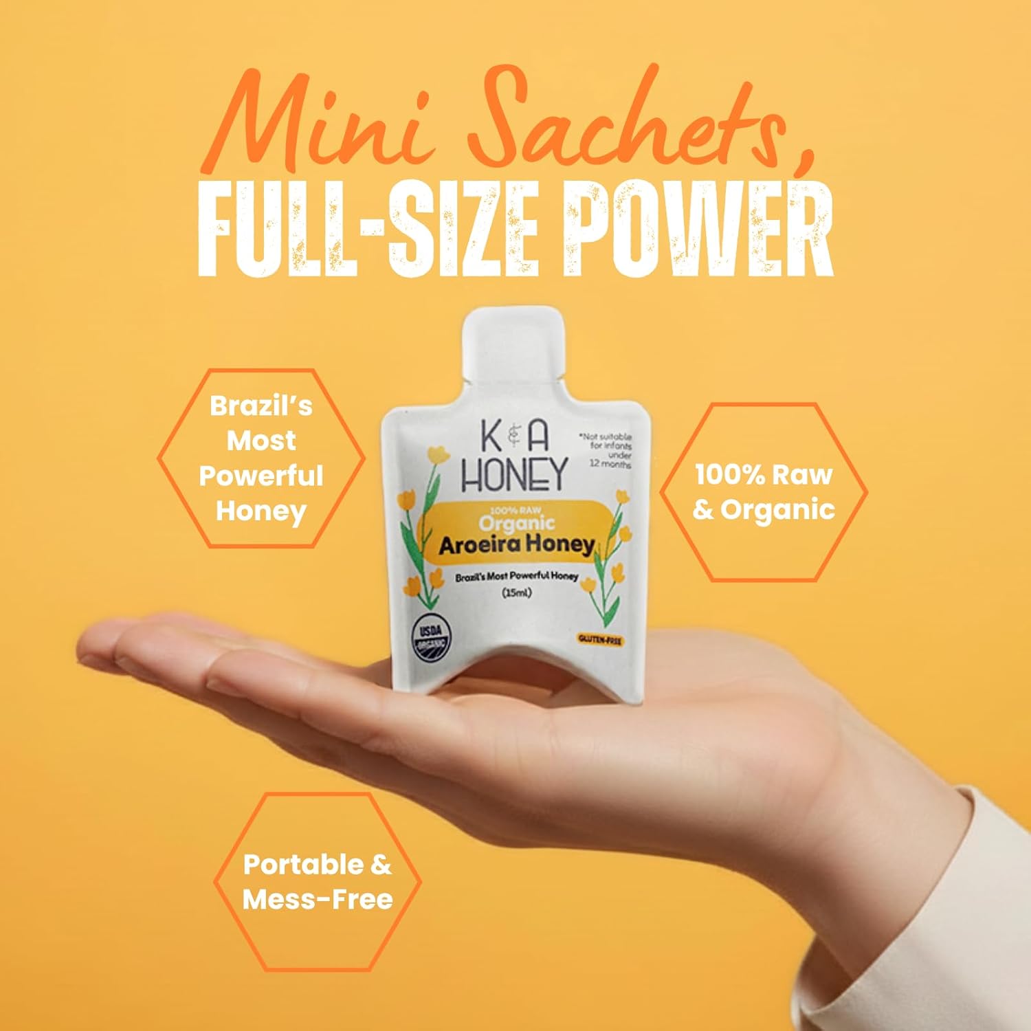 Discover the natural taste of K&A Honey Aroeira Flower Organic Honey, a pure Brazilian honey made from the blossoms of the Aroeira tree. This 100% organic raw honey is carefully harvested to maintain its natural flavor and nutrients. Enjoy the convenience of our single-serve packets — perfect for coffee, tea, smoothies, oatmeal, or snacks on the go. With no added sugar, no preservatives, and nothing artificial, it’s a simple and wholesome choice for your everyday routine. From hive to pack, K&A Honey guarantees purity, quality, and authenticity in every drop.