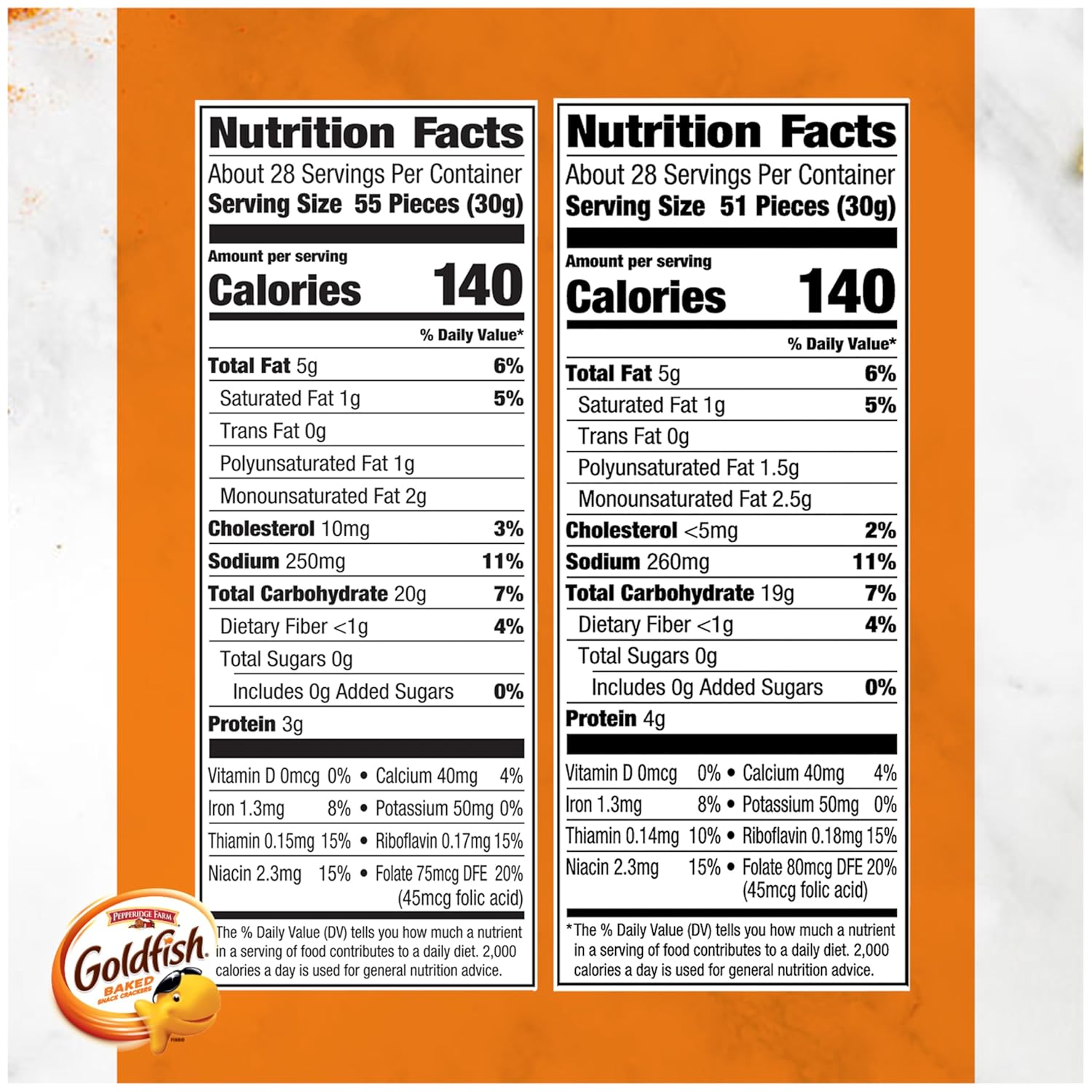 • 2 large cartons: stock up on Goldfish crackers with classic cheddar and flavor blasted xtra cheddar 30 ounce cartons (1 of each)