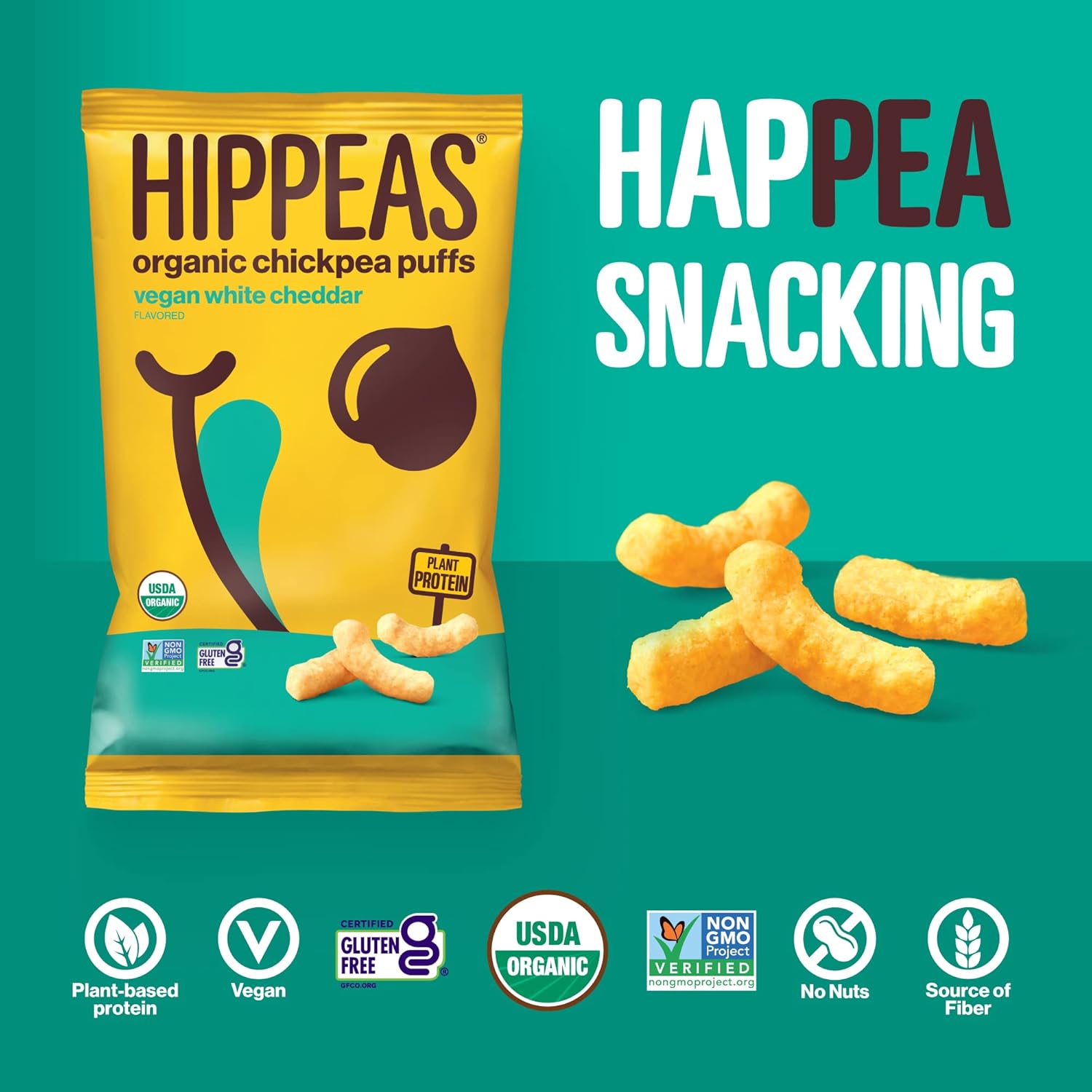 HIPPEAS Organic Chickpea Puffs are USDA organic, certified gluten-free, vegan and totally delicious! With 4g of plant-protein and 3g of fiber per 1 ounce serving, HIPPEAS are the new go-to snack for those who demand great taste and high-quality ingredients.