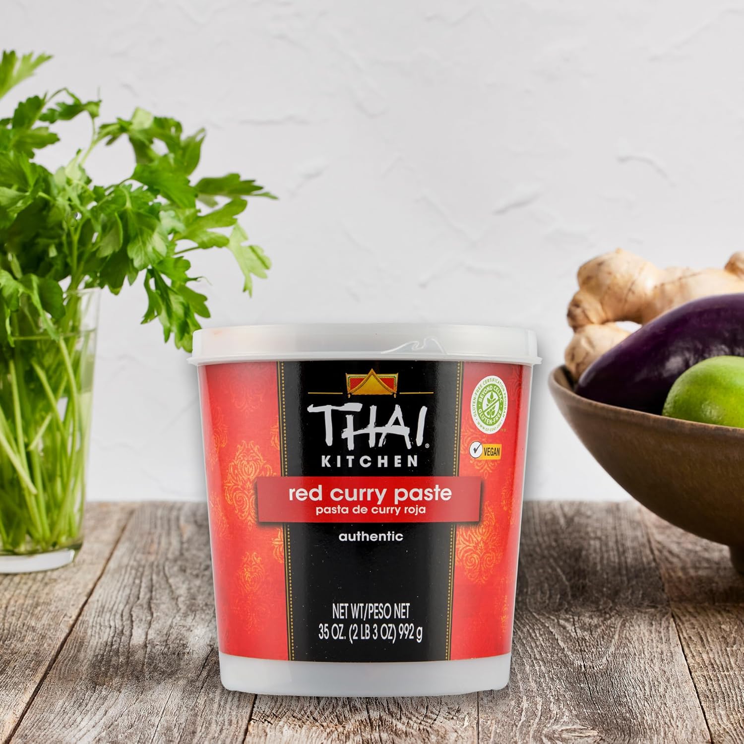 Thai Kitchen Gluten Free Red Curry Paste Marinade, Are you looking for a way to infuse your menu with a taste of Thailand? With Thai Kitchen Red Curry Paste, creating authentically flavored meals is now easier than ever. Each 35-ounce container of red curry paste contains a mixture of aromatic herbs that will complement everything from stir fry seasonings to seafood. Tailored especially with culinary professionals in mind, this bold paste will provide you with endless meal possibilities. To create flavorful heat, red chilies are used to make the base of the Thai curry paste. You'll receive a balanced mixture of garlic, lemongrass, galangal — known as Thai ginger — and other complementary spices in each container of Thai red curry paste. The results are rich, authentic dishes your customers will find hard to resist.This fragrant and flavorful Thai curry paste is ideal for delivering culinary-grade results regardless of how you use it. Having curry paste in bulk in your kitchen allows you to add a Thai flavor to any of your signature dishes. Whether you use it as a soup base or marinade, you'll inspire new menu items your customers will find hard to resist.Do you want to try something more traditional? You can blend Thai red curry paste with some coconut milk to create a mouthwatering Thai curry fast. If you're planning on serving some seafood, you can use this red curry paste to make a tangy, spicy fish sauce. Do you need a sauce for spring rolls? Use this Thai curry paste to mix up a sweet red chili sauce that will deliver unmatched flavor. Thai Kitchen Red Curry Paste is a kitchen staple you can feel good about serving to your guests. Each container of red curry paste contains no artificial colors or flavors. This product is also vegan and gluten-free for a premium taste all your customers will appreciate.