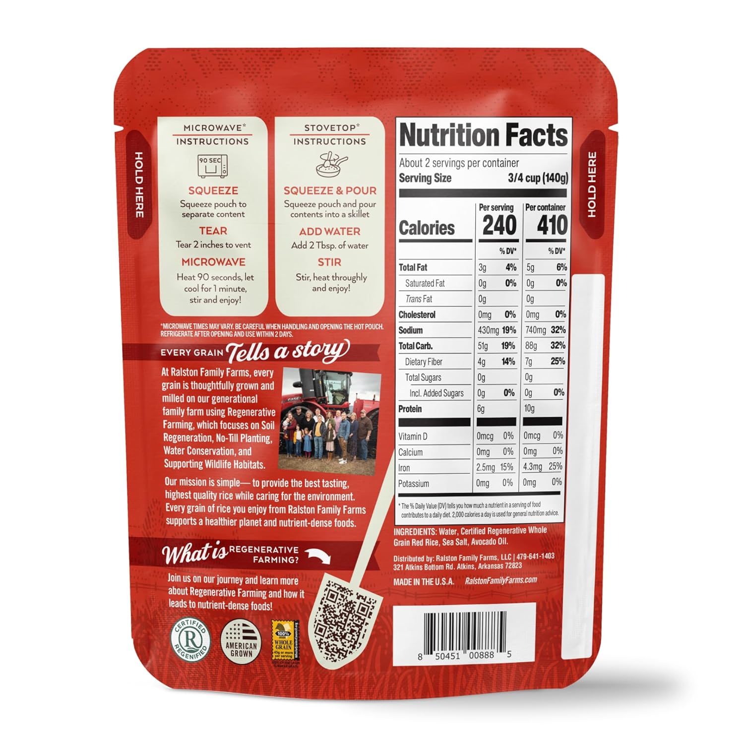 Ancient Grain Red Rice with avocado oil and sea salt. Packed with 8g protein per cup and ready in just 90 seconds! Perfect for quick, healthy meals.