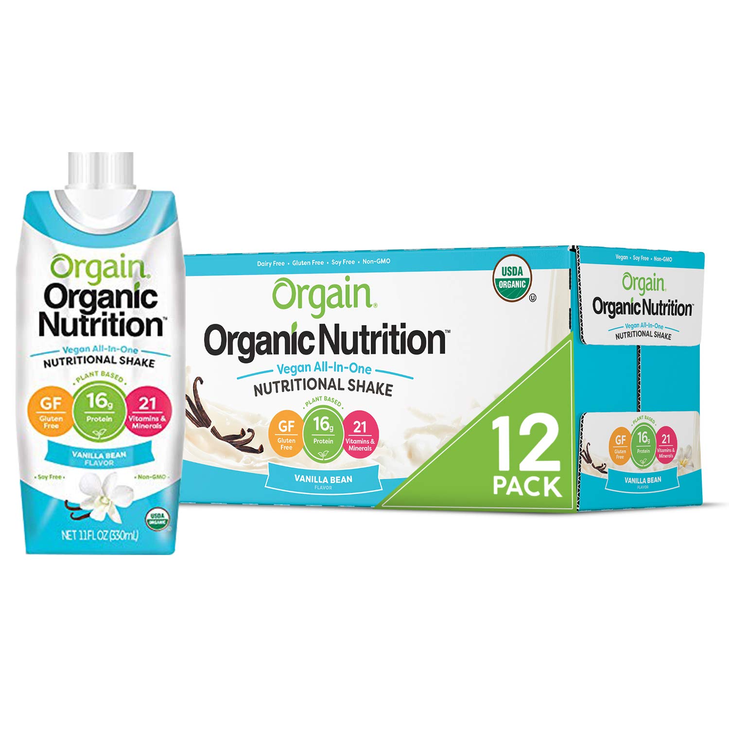 Orgain Organic Vegan Plant Based Nutritional Shake, Vanilla Bean - 16g Protein, 21 Vitamins & Minerals, Gluten Free, Lactose Free, Kosher, Non-GMO (Packaging May Vary) 12 COUNTOrgain Organic Vegan Sweet Vanilla Bean Nutrition Shakes are a naturally delicious and dairy each servin grams contains 16 grams of organic, plant based protein, 21 vitamins and minerals and 10 fruits and vegetables. USDA organic, gluten free, vegetarian, non GMO, soy free. No artificial flavors, colors or preservatives. They are low in carbs, diabetic friendly, carrageenan free, and a great protein supplement. Can be used for pre or post workout, busy lifestyles, and meal replacement.Orgain Organic Nutritional Shake, Strawberries & Cream - Meal Replacement, 16g Protein, 21 Vitamins & Minerals, Gluten Free, Soy Free, Kosher, Non-GMO, 11 Ounce - Pack of 12 (Packaging May Vary)Orgain Organic Strawberries & Cream Nutrition Shakes are a naturally delicious on the go nourishment drink with 16 grams of organic protein, 21 vitamins and minerals and 10 fruits and vegetables per serving. USDA organic, gluten free, vegetarian, non GMO, soy free. No artificial flavors, colors or preservatives No artificial flavors, colors or preservatives. Perfect for both men and women on the go or students. This protein nutritional shake can be used as a meal replacement or for post workout.