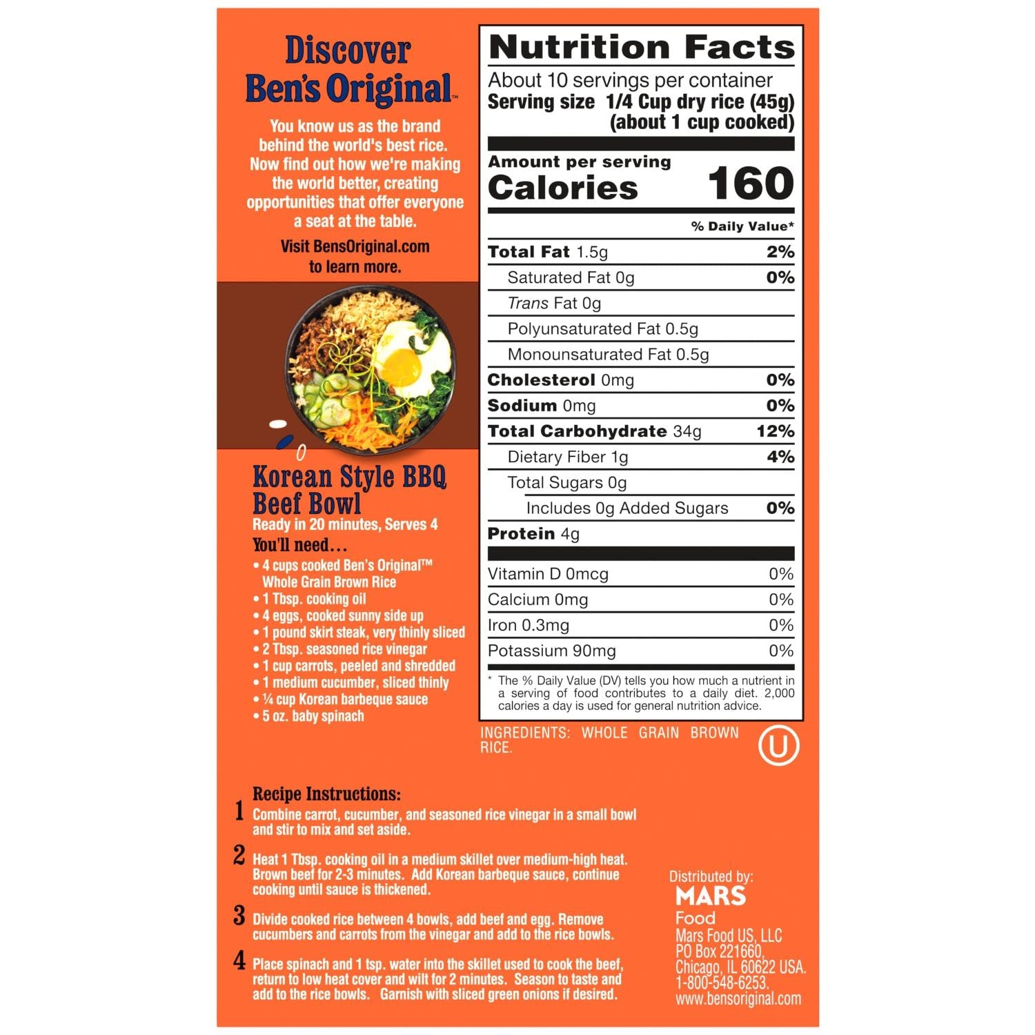 BEN'S ORIGINAL Whole Grain Brown Rice offers a flavorful addition to a well-balanced diet, letting you prepare a variety of cooked rice meals that the entire family is bound to savor. The 100% whole grains of brown rice combine a delicious grainy taste, nutty aroma and chewy texture; a perfect low-fat and sodium-free blend for a discerning palate. Preparation is a cinch — simply add this rice and water in a saucepan, reduce the heat to Medium or Medium-Low after bringing it to a boil, then let it simmer for about 30 minutes. If you have a busy lifestyle, you can use a rice cooker to make a yummy side dish while attending to the little rascals running around the house. Bring something exciting and reliably delectable to the table by readying a Korean style BBQ beef bowl mixed with this whole grain rice, or whip up a vitamin-packed soup by combining the brown rice with carrots, parsnip, celery and garlic. Made with no artificial colors, flavors or preservatives, BEN'S ORIGINAL rice adds a wholesome experience to your meals, making it easy to prepare high-quality, appetizing dishes for a memorable lunch or dinner. BEN'S ORIGINAL is dedicated to creating meals and experiences that offer everyone a seat at the table.