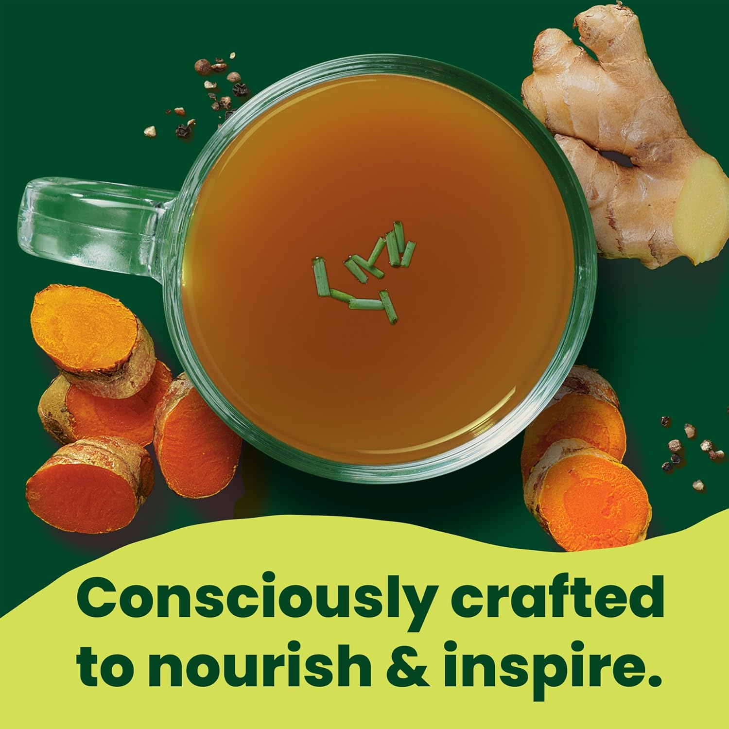 Experience layers of nourishing flavor with Pacific Foods Organic Chicken Bone Broth With Ginger, Turmeric, and Black Pepper. We slow-simmer organic chicken bones with vegetables, ginger, turmeric, and black pepper for a savory bone broth that’s full of naturally occurring collagen and has a subtle kick. Sip a cup of warm chicken bone broth instead of coffee or tea for a delicious, satisfying addition to your everyday routine. It's great for refueling after workouts, beating the afternoon slump, or relaxing in the evening. Just pour, heat and enjoy! For an even better sipping experience, add a slice of lemon, ginger or some fresh herbs. Our USDA-certified organic bone broth is made from non-GMO ingredients and free of gluten. It may also be suitable for paleo and keto diets. Each 1-cup serving of Pacific Foods Organic Chicken Bone Broth contains 8 grams of protein, 1 gram of carbs and 40 calories. One 32 oz recyclable carton contains roughly 4 servings. In addition to drinking it as a traditional sipping broth, you can use this bone broth in any recipe that calls for chicken broth, chicken stock or water. Try it as a soup base, to enhance sauces, or to cook veggies.
