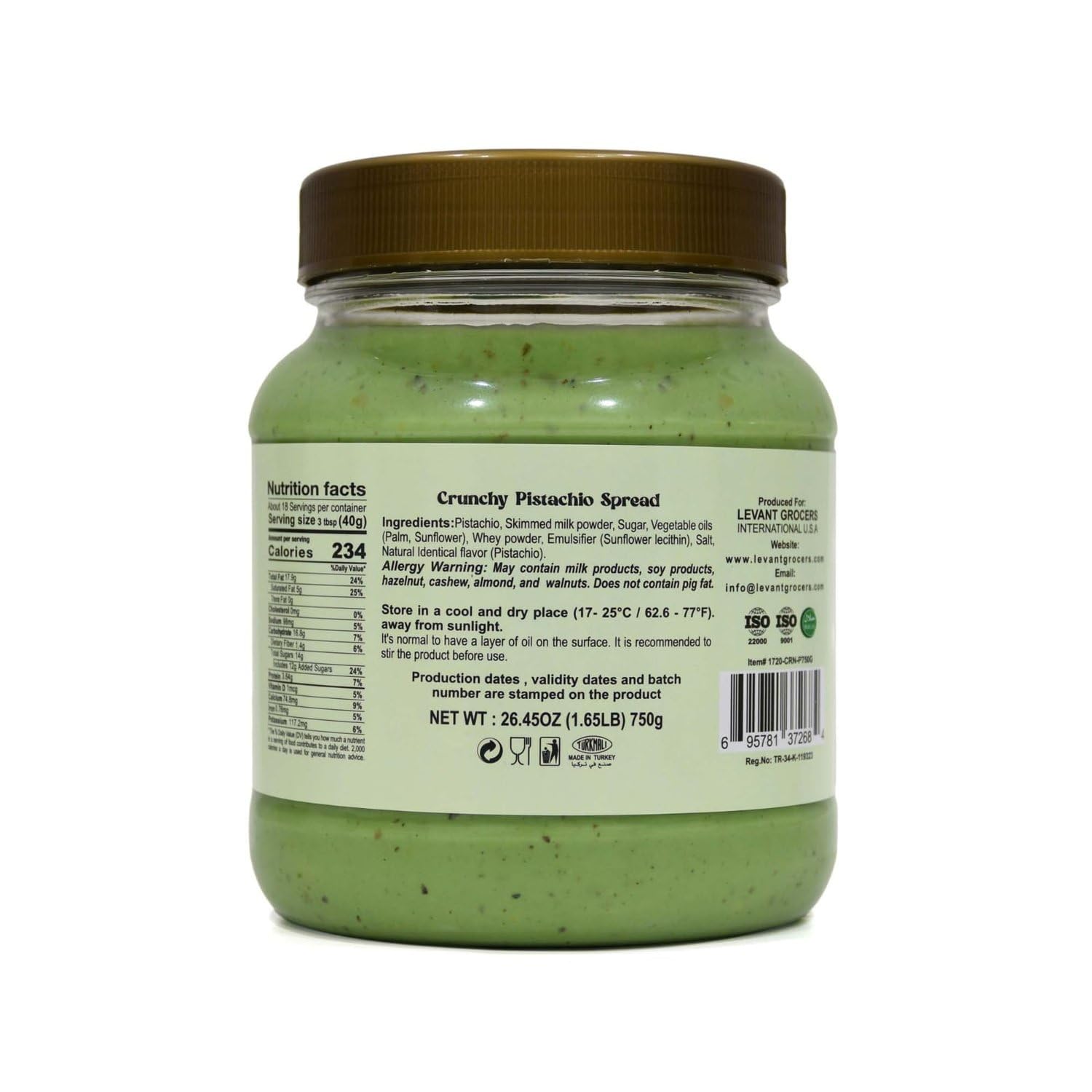 Indulge in the luxurious taste of this crunchy pistachio spread, perfectly crafted to deliver a smooth, rich texture and authentic nutty flavor. This 26.45 oz (750g) jar offers approximately 18 servings of pure delight. The spread combines premium pistachios with skimmed milk powder and carefully selected ingredients for a perfectly balanced taste. Each 40g serving provides 234 calories of satisfying goodness. The spread's beautiful green hue reflects its natural pistachio content, while its creamy consistency makes it perfect for spreading on bread, incorporating into desserts, or enjoying straight from the spoon. Store in a cool, dry place between 62.6-77°F to maintain optimal freshness. Please note: contains milk products and may contain traces of other nuts. This versatile spread is ideal for breakfast, snacking, or as a delicious addition to your favorite recipes. Perfect for spreading on toast, swirling into yogurt, drizzling over desserts, or to use with as a main ingredient when you're making "Dubai Chocolate", pistachio spread adds a touch of indulgence to any treat. Its vibrant green hue and creamy texture make it a favorite for pastry fillings, macarons, and gelato. Some variations include white chocolate or a hint of vanilla for extra sweetness, while others keep it pure and nutty for a more authentic taste. FOOD ALLERGY? Please be advised that any of our products may contain, or may have come in contact with food allergens including eggs, fish, milk, peanuts, sesame, shellfish, soy, tree nuts, and wheat. For the most up-to-date ingredient information, see Nutrition & Ingredients.