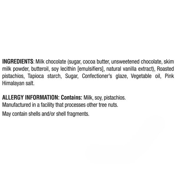 CHOCOLATE PISTACHIOS, MILK CHOCOLATE (SUGAR, COCOA BUTTER, UNSWEETENED CHOCOLATE, SKIM MILK POWDER, BUTTEROIL, SOY LECITHIN [EMULSIFIERS], NATURAL VANILLA EXTRACT), ROASTED PISTACHIOS, TAPIOCA STARCH, SUGAR, CONFECTIONER'S GLAZE, VEGETABLE OIL, PINK HIMALAYAN SALT.