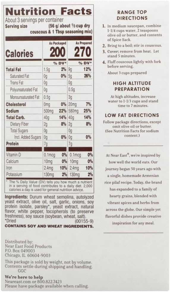 This garlic and olive oil couscous mix offers a quick and flavorful side dish inspired by Mediterranean cuisine. Made with premium durum wheat semolina and delicately seasoned with savory garlic and a hint of olive oil, it cooks in just five minutes, making it a convenient option for weeknight meals or entertaining.