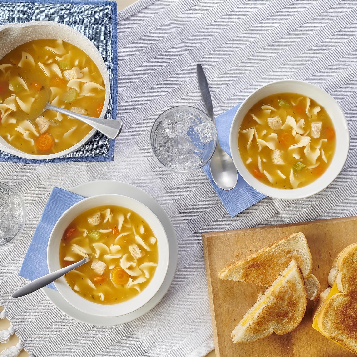 Savor every spoonful of our delicious chicken noodle soup that is low fat.* Progresso 99% Fat Free* Chicken Noodle Soup features tasty chicken broth, carrots, chicken, egg noodles, celery, and more. This microwavable soup can be ready to eat in minutes following the easy directions on the can. Pair a bowl of Progresso soup with a toasted sandwich or fresh bread to add warmth and coziness to a meal. Each serving is made without artificial flavors or colors from artificial sources, and has no added MSG.** Just the delicious taste you expect from Progresso. At Progresso, we're passionate about making great products. We've been creating soups ranging from Chicken Noodle to Tomato Basil and beyond for more than 100 years. And today, Progresso still uses quality ingredients for enticing flavor found in our line of canned soup products. *See nutrition information for sodium content. **Except that which occurs naturally in hydrolyzed vegetable proteins and tomato extract. Contains one 19 oz can of shelf-stable Progresso Traditional 99% Fat Free Chicken Noodle Soup; about two servings per can.