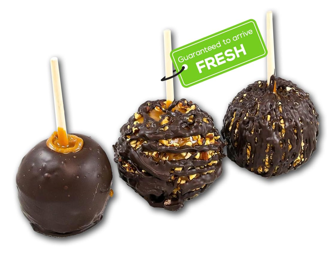 DARK CHOCOLATE CARAMEL APPLE PACK: Our pack of 3 caramel apples offers a delightful assortment of chocolatey flavor combinations. Each Granny Smith Apple is hand-dipped in our famous caramel and dipped or drizzled in rich dark chocolate. Also features crushed almonds and peanuts for an additional crunch.HANDMADE WITH CARE: Our sweets are handcrafted in small batches with care and attention to detail, ensuring that every item is a unique and delicious work of art. We use only the highest quality ingredients to create a tasting experience that is sure to delight your taste buds.PERFECT GIFT FOR ANY OCCASION: Surprise someone special with a delicious gift that is perfect for any occasion. Our sweets are hand-crafted with care and attention to detail, making them a thoughtful and impressive gift that will be remembered long after it's been enjoyed.GUARANTEED TO ARRIVE FRESH: Our products are made to order, ensuring that you receive the freshest and most delicious treats possible. We wrap and package our products in durable plastic boxes and ship them with several layers of bubble wrap to ensure that they arrive at your door perfectly fresh.Made in USA.