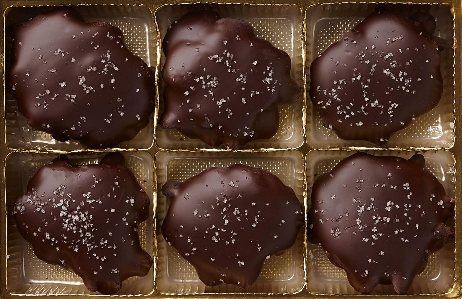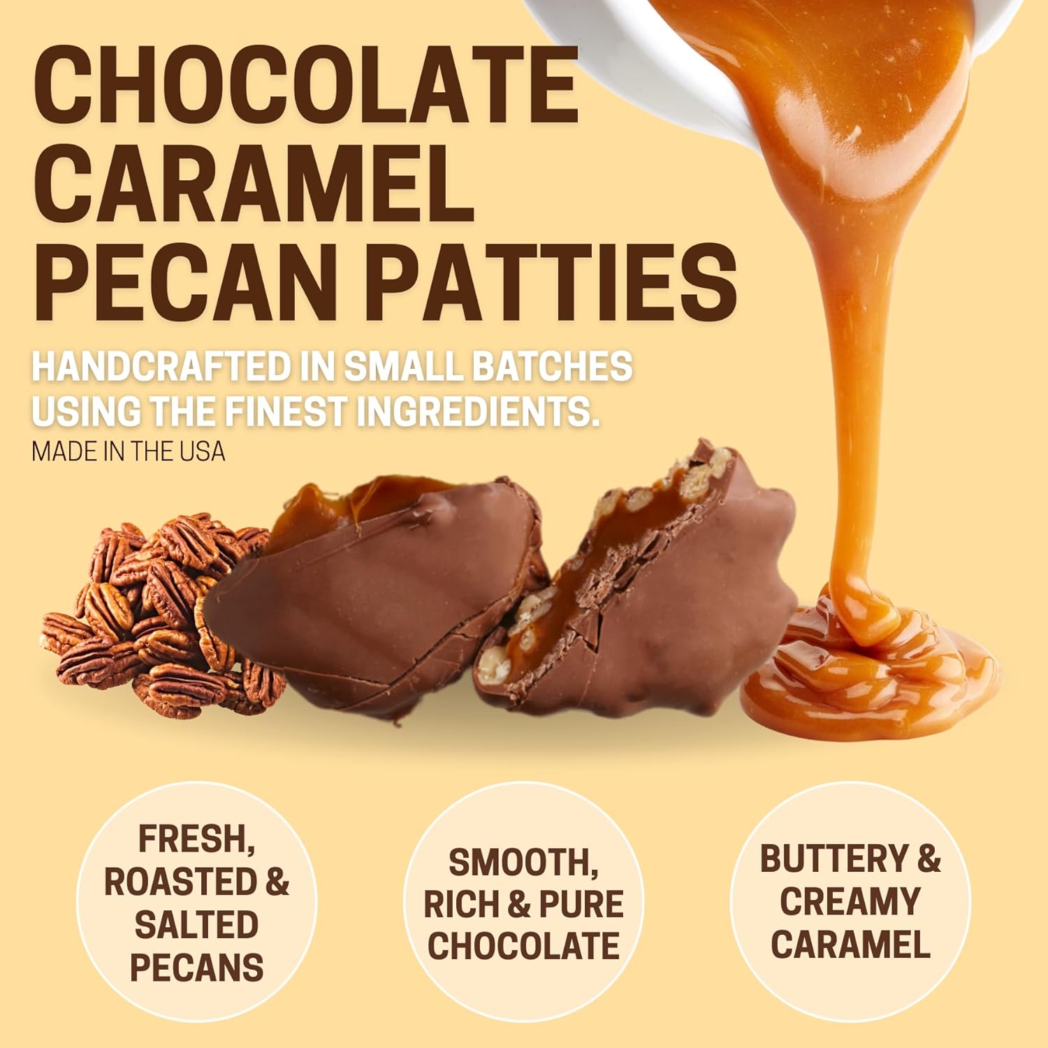We start with jumbo, roasted and salted pecan halves and top them with a generous dollop of buttery, rich caramel.Next the patties are covered in rich dark chocolate and sprinkled with sea salt for a mouth watering taste you'll crave over and over.