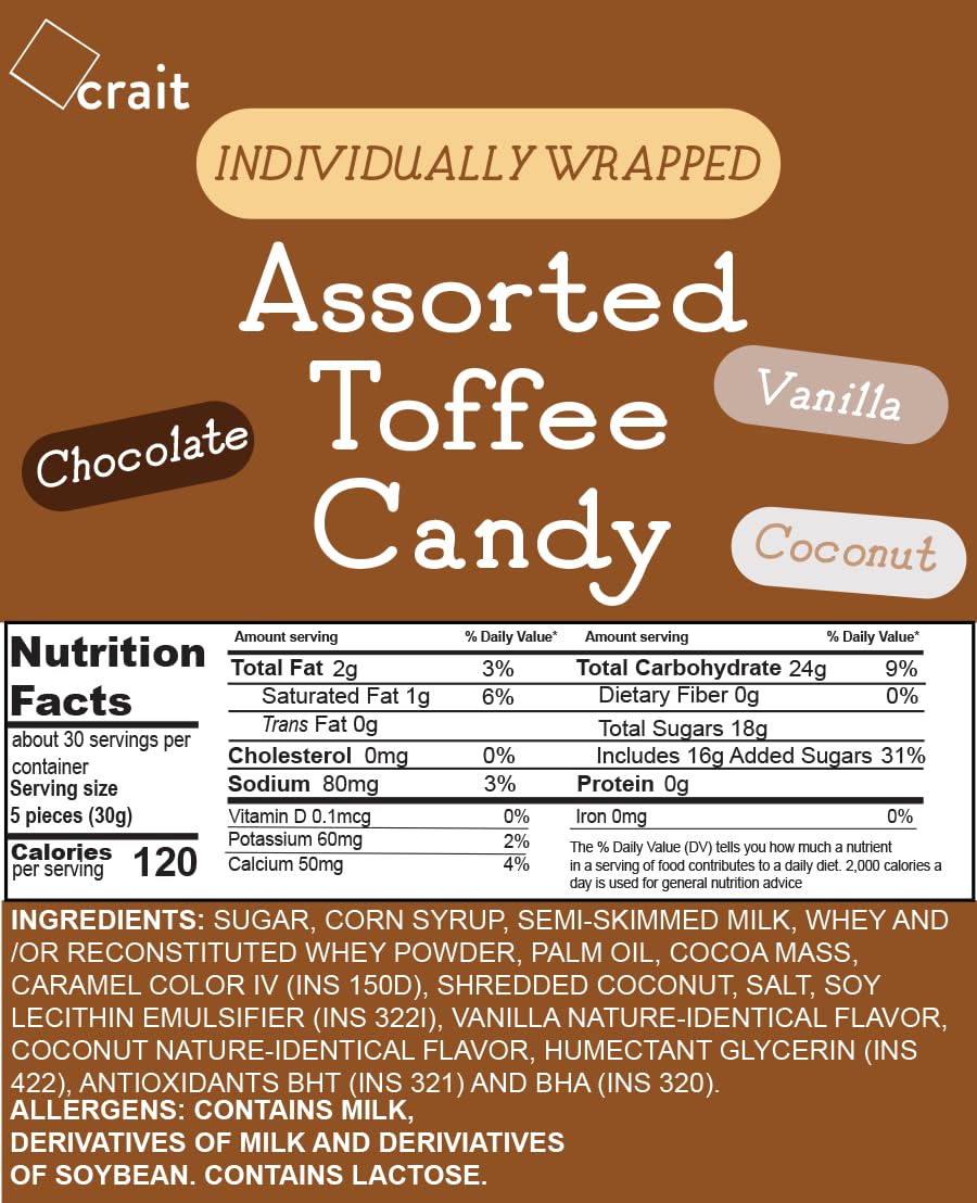 Assorted Toffee Candy Individually Wrapped, Chewy Toffee Candy Chocolate, Vanilla and Cocount Bulk 2 Pound