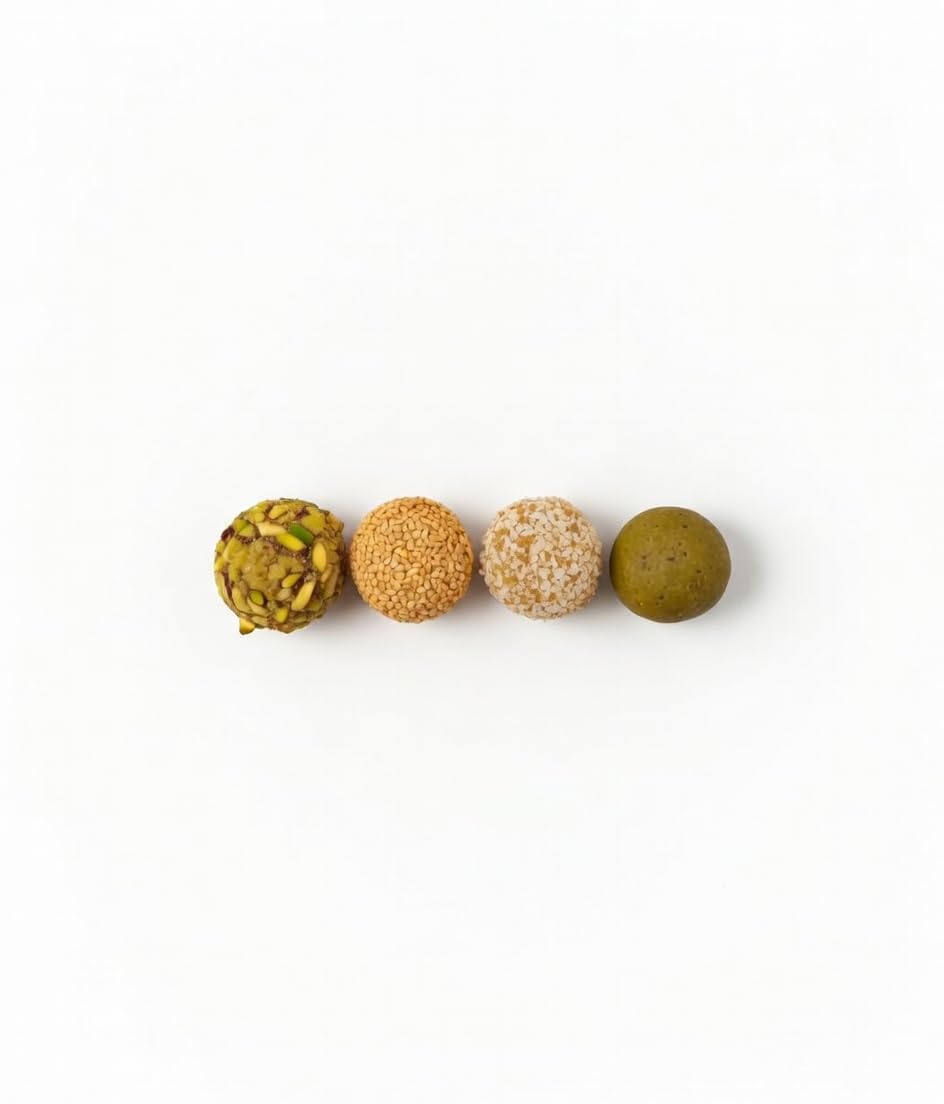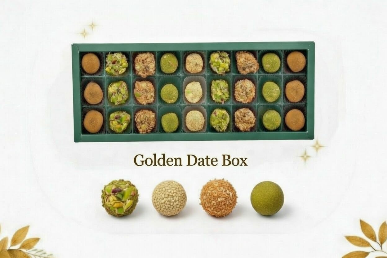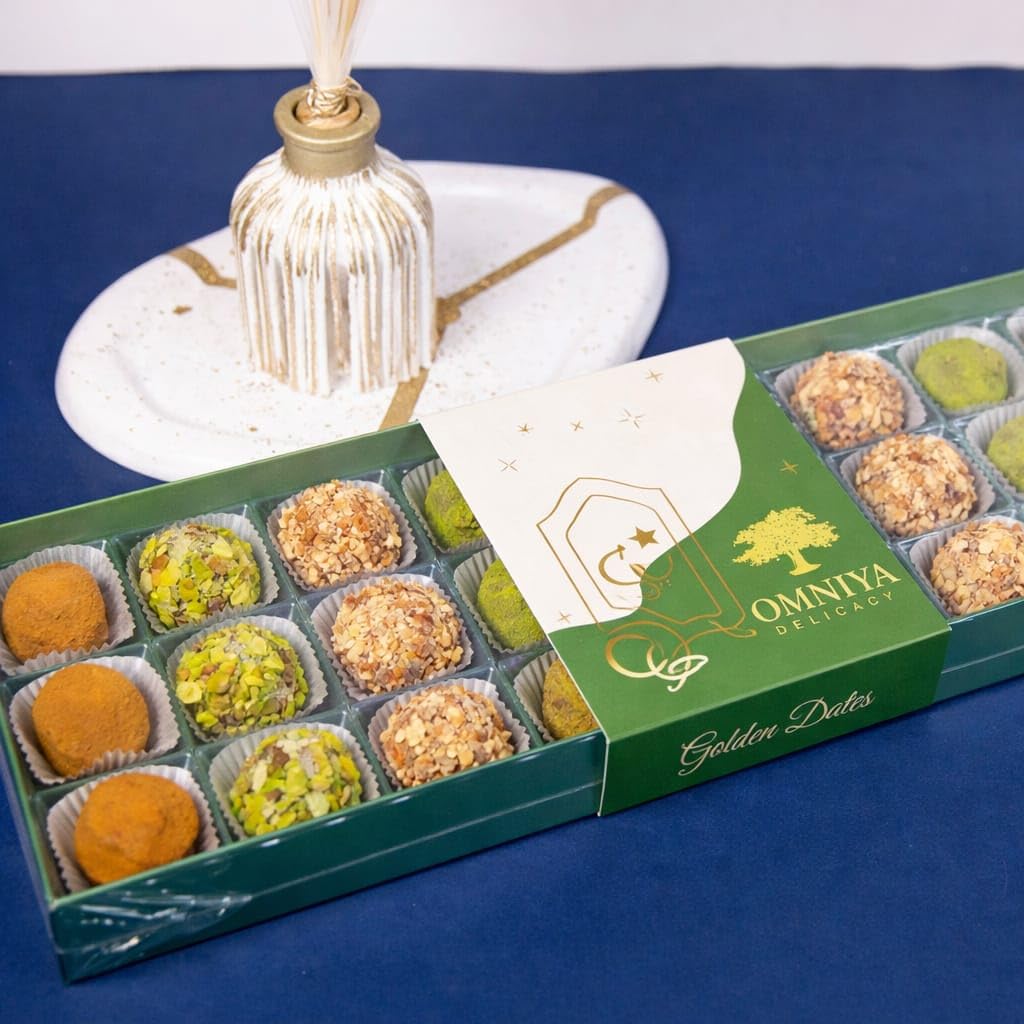 Omniya Luxury Assorted Date Treats – 27 Gourmet Date Paste Pieces Coated in Pistachio, Lotus, Sesame, and Almond – High-Quality & Delicious Gift Box Premium Ingredients: Made with soft, rich date paste coated in high-quality toppings like pistachio pieces, grounded pistachio, lotus, sesame, and almond. Variety of Flavors: Indulge in a luxurious assortment of 27 date treats, each offering a unique and delightful taste experience. Elegant Presentation: Beautifully arranged in a sleek, eye-catching box, perfect for gifting on special occasions. Healthy Indulgence: Naturally sweetened with dates, offering a nutritious treat packed with energy and nutrients. Perfect Gift Idea: Ideal for Ramadan, holidays, birthdays, or as a thoughtful corporate gift. Freshness Guaranteed: Each piece is carefully crafted to ensure maximum freshness and quality. Halal & Vegan-Friendly: A suitable and wholesome choice for a variety of dietary preferences. Healthy Alternative: A wholesome option that can replace traditional cake pops for health-conscious celebrations and events.