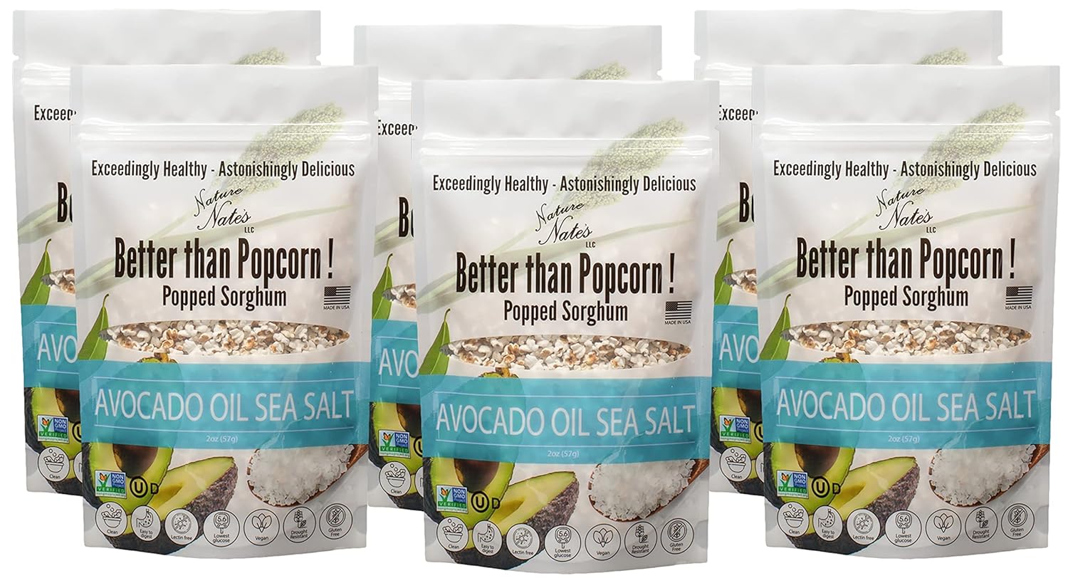 6 pack of 5 oz packages of Sorghum popped with avocado oil and flavored with sea salt.