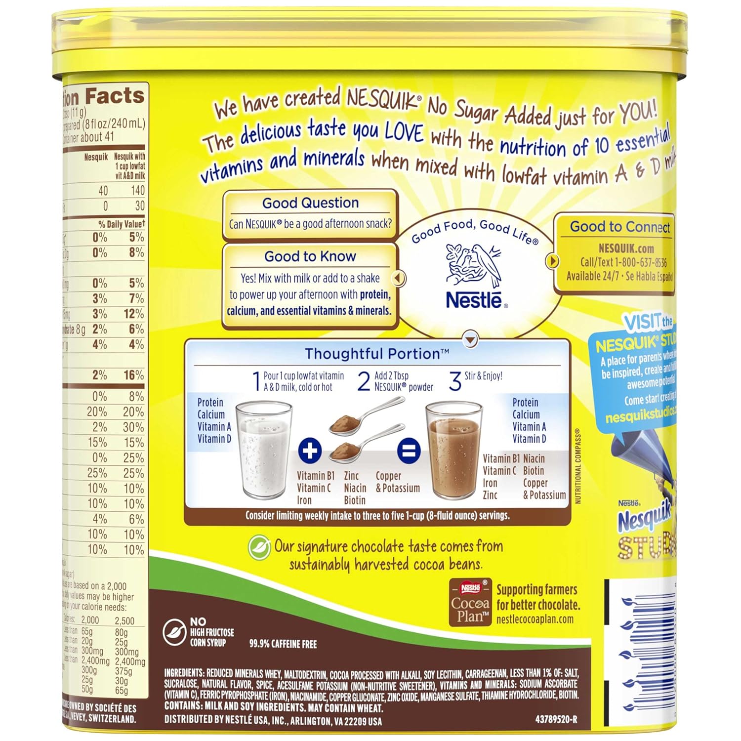 NESQUIK No Sugar Added Chocolate Powder turns milk into a treat that has the taste you love and the nutrition you need. Flavored with real cocoa, NESQUIK provides 8 grams of protein and 10 essential vitamins and minerals when combined with lowfat vitamin A D milk. Our powder has no high fructose corn syrup, and is certified kosher. So, whether you need a post-workout protein boost or want a tasty after-school snack for the kids, NESQUIK is there to help take on the day.