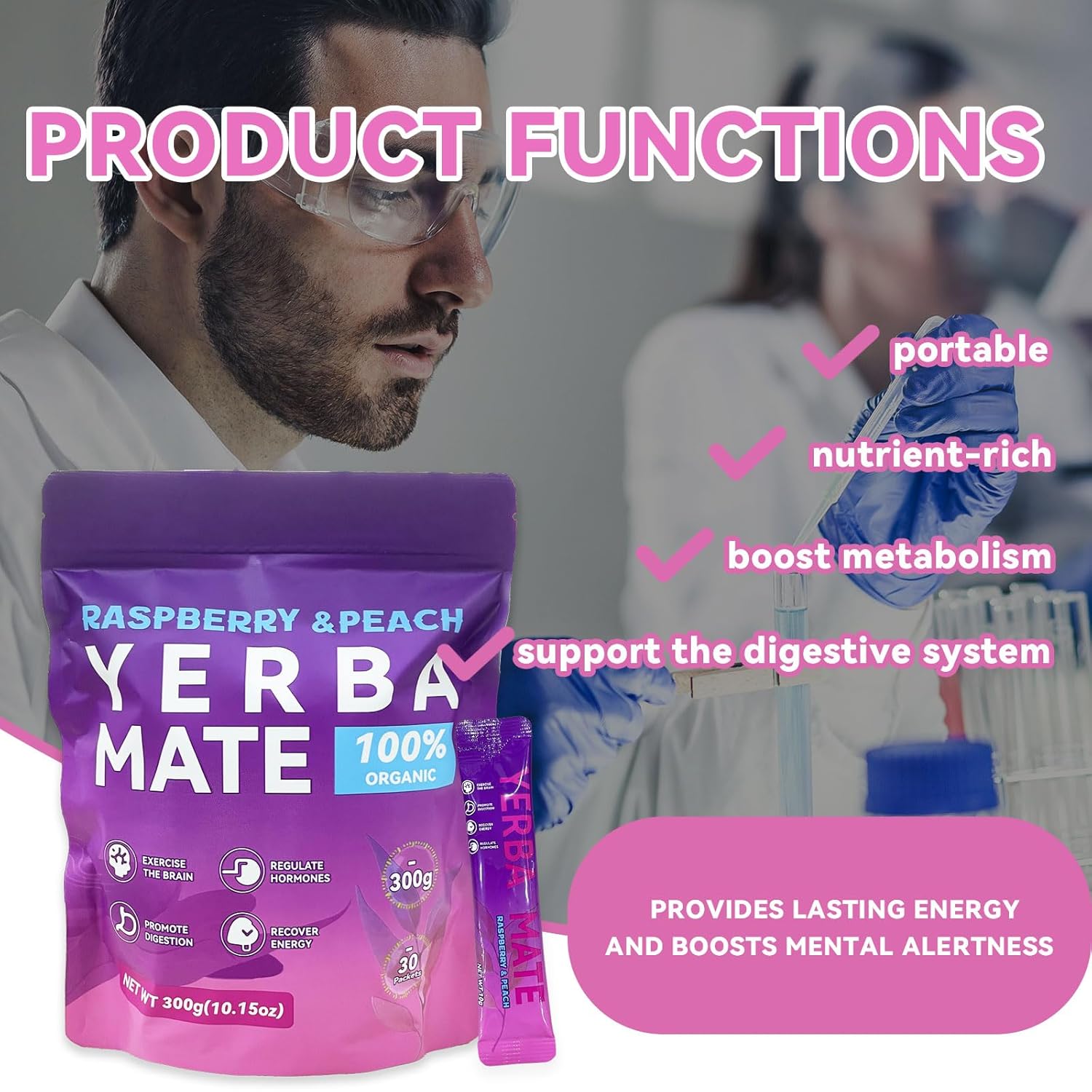 Yerba Mate Instant Tea Powder - Raspberry Peach Flavor - Super Drink with Nootropics, Prebiotics & Probiotics - Gut Health, Clean Energy, Energy Boost & Focus - 30 Sticks (300g)