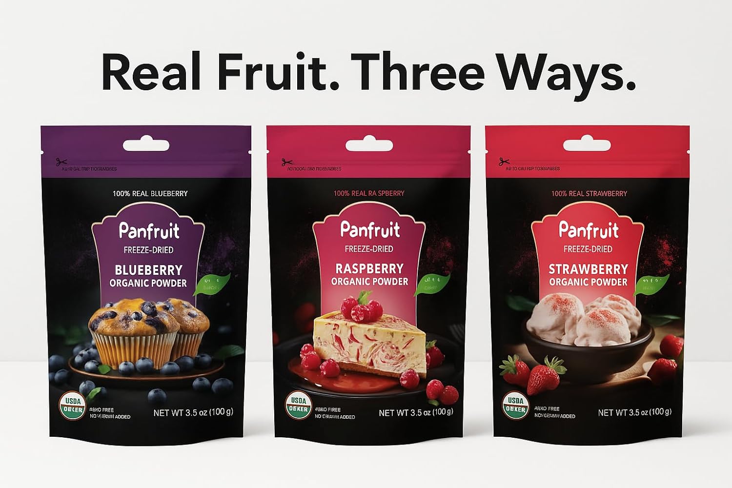 Panfruit Freeze-Dried Organic Berry Powder Variety Pack (Blueberry, Raspberry, Strawberry) – 3 Pack, 3.5 oz Each – No Sugar Added, 100% Whole Fruit, Smoothie & Baking Mix