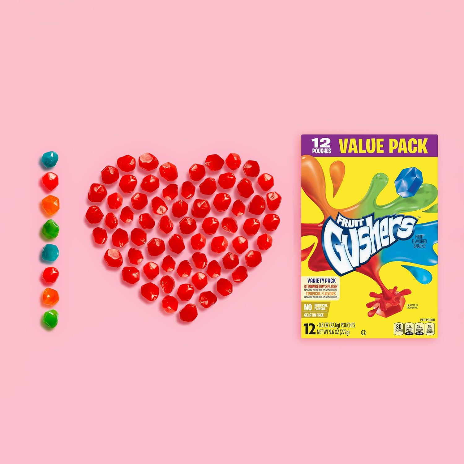 Gushers are bursting with fun! Gushers have a juicy center that bursts open with delicious fruity flavored liquid. Enjoy delicious Gushers Fruit Flavored Snacks, filled with Strawberry Splash and Tropical flavors. These individually wrapped snack bags are the perfect treat to include in a packed school lunch box. These tasty gummy treats are made without gluten, gelatin, or artificial flavors and contains vitamin C for snacks you can feel great about. These bulk Fruit Flavored Snacks are the perfect addition to your pantry and a snack every member of the family will love. Variety Pack contains 12 fruit flavored snack pouches total.