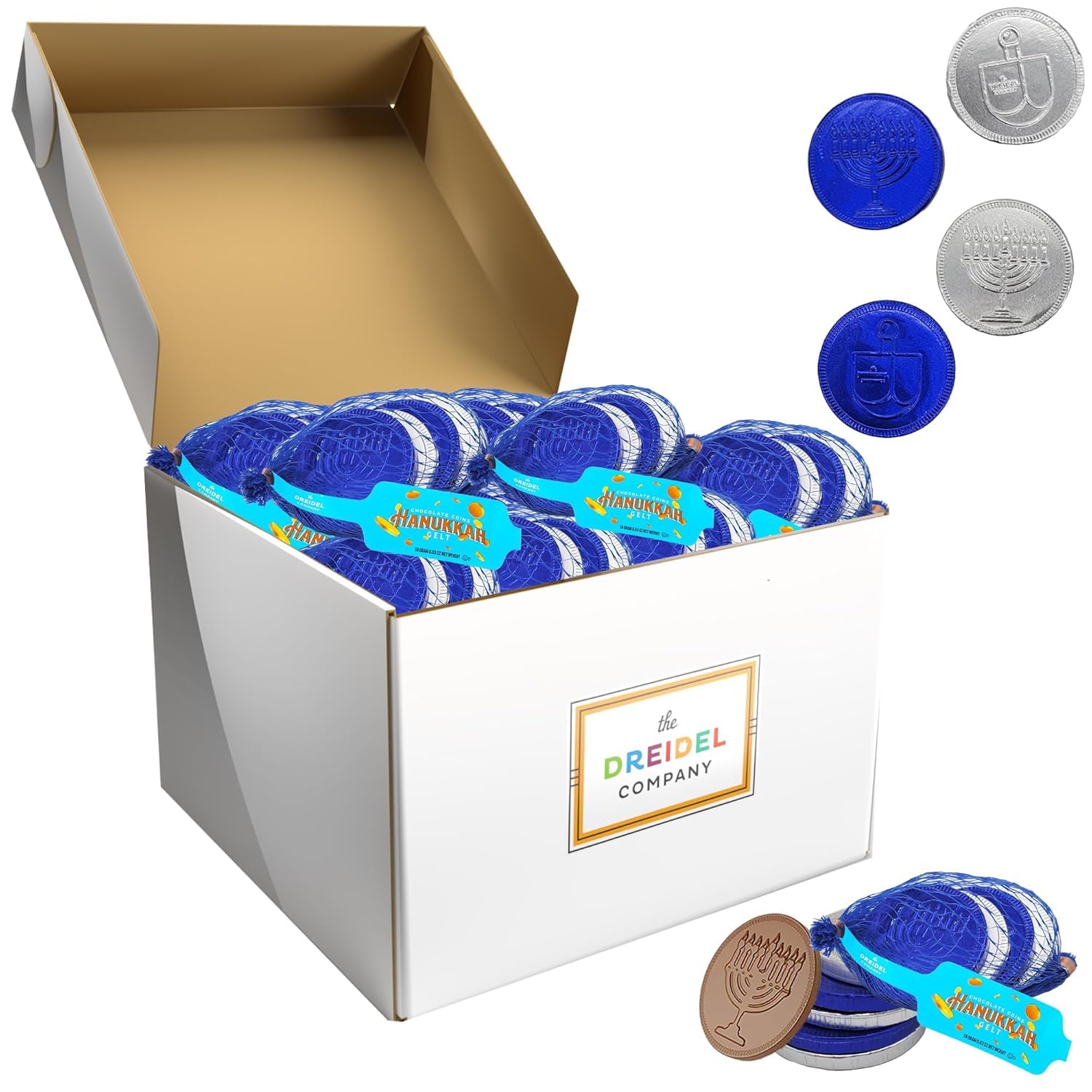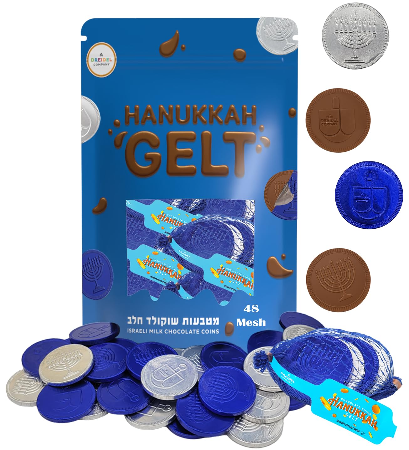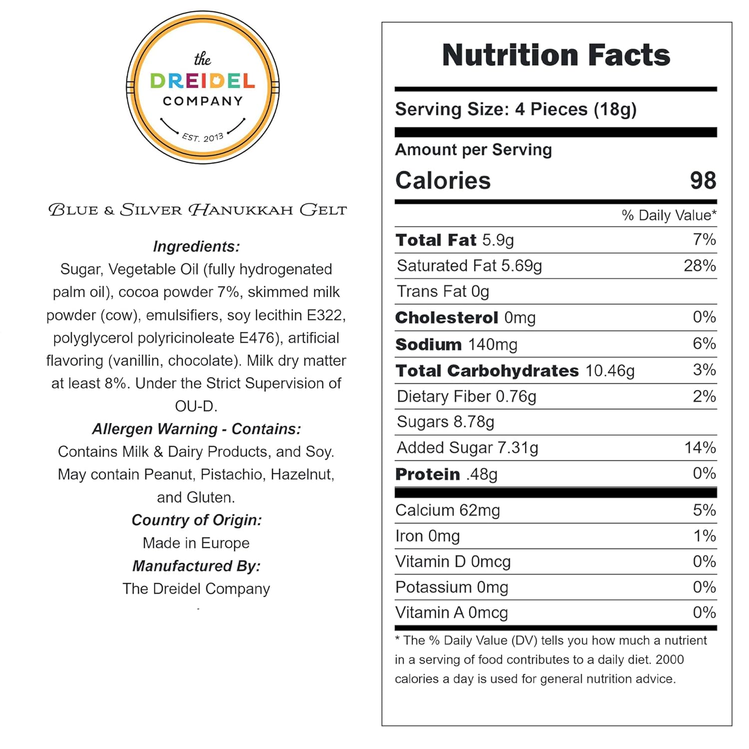 The Dreidel Company Blue & Silver Hanukkah Mesh Bags Milk Chocolate Coins, Hanukkah Menorah & Dreidel Design Gelt, Non GMO, Kosher Certified OU-D. These Hanukkah Gelt Coin Chocolates are the Highlight for everyone on Chanukah. There is no Chanukah Party that can Start without giving the kids from these Milk Chocolate Gelt at the Menorah Lighting. It adds Fun and Atmosphere to your Party that will leave Good Memories to all your Guests. PACKAGE: The Milk Chocolate Coins come in a 6, 12, 24, 48, 96, 144, 288, 576-Pack Mesh Bag individually wrapped in Blue & Silver Menorah Design Foils! Great for hiding in Goody Bags and Hand Them Out to All Your Party-Goers as a Tasty Party Favor. The Chocolate Hanukkah Coins are the perfect addition to any Party. All your guests will enjoy seeing them as decorations and eating them! They are wonderful for Office Celebrations, Birthday Parties, Carnival Prizes, Classroom Rewards, Goodie bag Fillers, Gatherings, and much more! Ingredients: sugar, vegetable oil (fully hydrogenated palm oil), cocoa powder 7%, skimmed milk powder (cow), emulsifiers (sunflower lecithin E322, soy lecithin E322, polyglycerol polyricinoleate E476), artificial flavoring (vanillin, chocolate). Milk dry matter at least 8%.