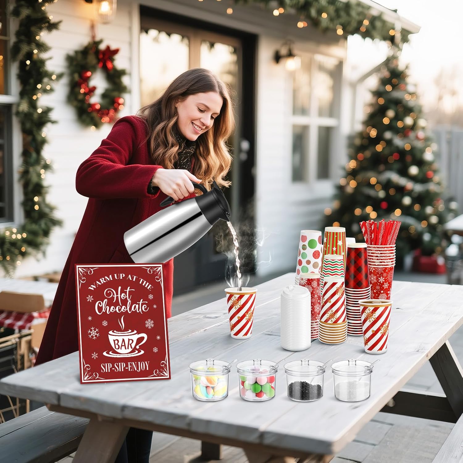 Features: Guaranteed material: The Christmas paper cups are made of thick paper that resists cracking and deformation, allowing them to use for both hot and cold drinks without leaks. The insulated water bottle features a food grade stainless steel liner, and the transparent, nontoxic acrylic jar makes the entire set safe and hygienic, ensuring peace of mind for drinking. Detailed design: From the leak proof lidded paper cups to the adjustable straw size and decorative posters, every detail has been meticulously considered, making party planning easier and the guest experience more enjoyable Specifications: Material: acrylic, metal, paper Color: multicolor Size: Acrylic jars: 2.76 x 3.54 inches/7 x 9 cm Sign board with stand: 7.87 x 9.84 inches/ 20 x 25 cm Disposable Christmas paper cups: 16oz Stainless hot water carafe: 2000 ml Straws: 7.76 inches/ 197 mm Package includes: 1 x Sign board with stand 4 x Acrylic jars 48 x Disposable Christmas paper cups 1 x Stainless hot water carafe 50 x Straws Notes: Manual measurement, please allow slight errors on size. The color may exist a slight difference due to different screen displays