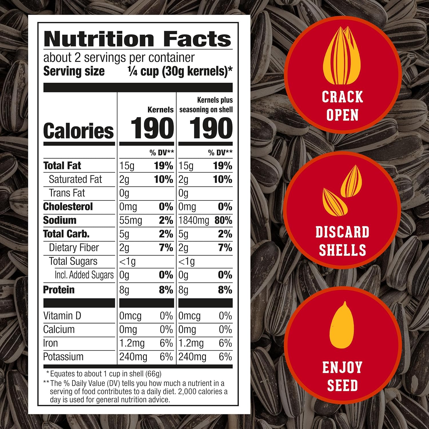 DAVID Bacon Mac and Cheese Flavored Salted and Roasted Jumbo Sunflower Seeds are delicious sunflower seeds that are fun to eat anytime, anywhere and are bigger than the normal sized DAVID sunflower seeds. Unlike other bacon sunflower seeds you've tried, these jumbo sunflower seeds are full of that salted and roasted flavor you've come to expect from DAVID with the added flavor of bacon mac and cheese flavoring. Crack open the shells, discard the shells and enjoy seeds! These flavored sunflower seeds are gluten free snacks, made with no artificial flavors, are keto friendly (7g of protein, 2g net carbs [4g total carbs minus 2g dietary fiber], and 0g added sugar per serving) and fit a low carb lifestyle (2g net carbs per serving [4g total carbs minus 2g dietary fiber]). DAVID jumbo sunflower seeds are fun and engaging salty snacks. DAVID seeds can help with mental focus during the work day or while studying, they can help athletes stay alert during games, and they can help pass the time during long road trips. These salted and roasted sunflower seeds are packaged in a conveniently sized bag so you can take this snack with you wherever you go. DAVID is an American Original, salted and roasted sunflower seeds since 1926. They are delicious and fun to eat anytime, anywhere.