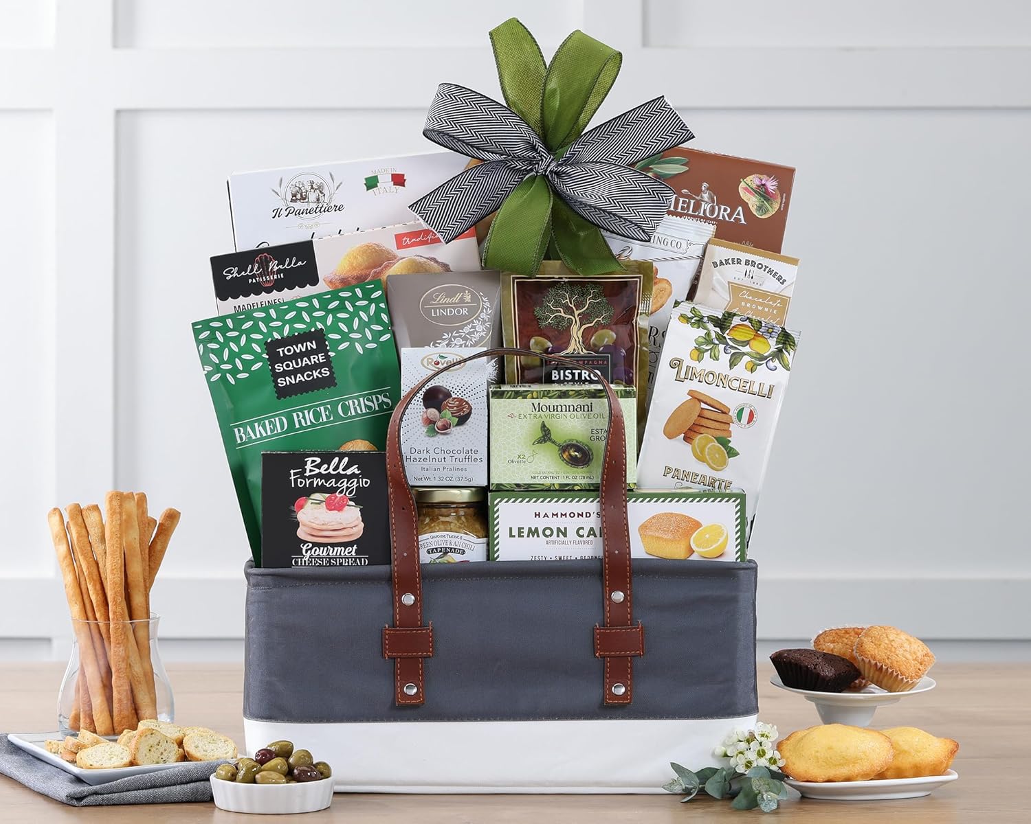 Celebrate and share with this gourmet gift basket filled with a collection of sweet and savory Wine Country favorites. Italian sesame cranberry cookies, vanilla fudge with sea salt, raspberry and blackberry fruit jelly candy, caramel popcorn, vanilla sea salt caramels, lemon cakes, Italian snack crisps with olives, sesame crackers, green and black olive tapenade, garlic herb dip mix, honey mustard sourdough pretzels, basil thyme artichoke snacks, olives and a madeleine cake make The Connoisseur your go-to gift for families, friends and clients. Gift Size: 15" x 7" x 13" Item 517
